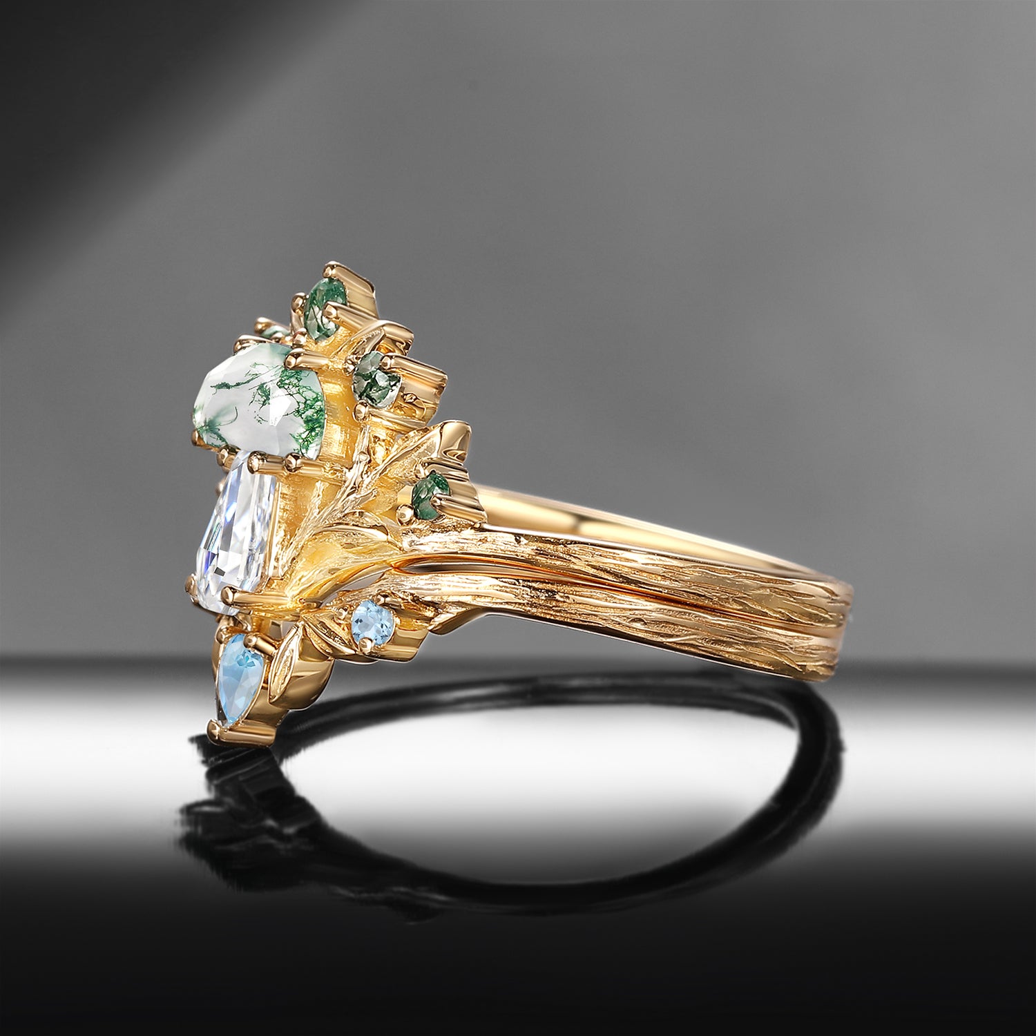 Gave them a photoshop mock up of what colors I wanted and told them what stones I thought would work and they sent me their own mock up and the final result came out amazing! Also asked if they could combine/solder the 3 rings together so I didn't have to deal with rotations.