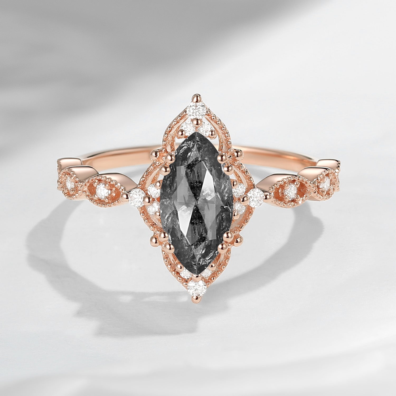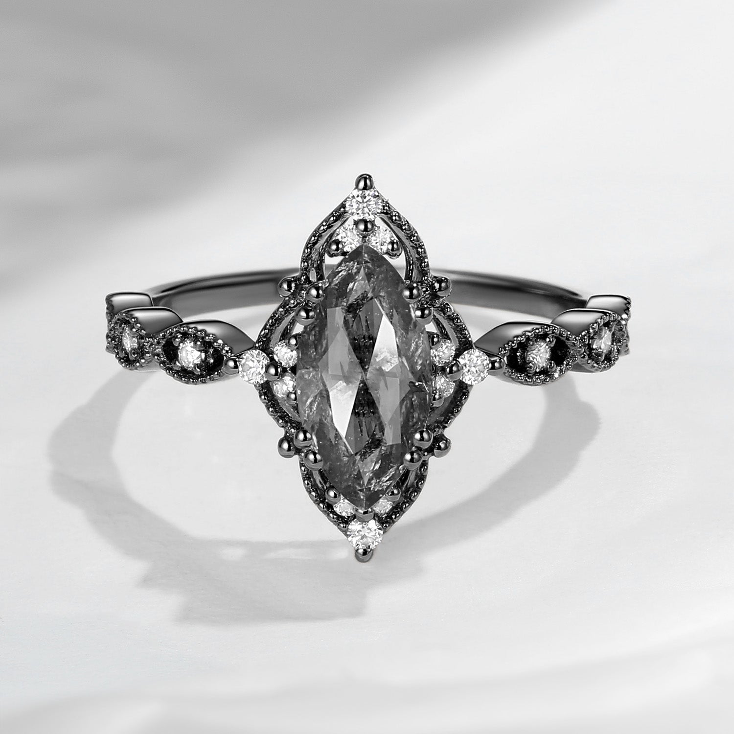 Unique Marquise Cut Natural Salt And Pepper Diamond Vintage Inspired Engagement Ring