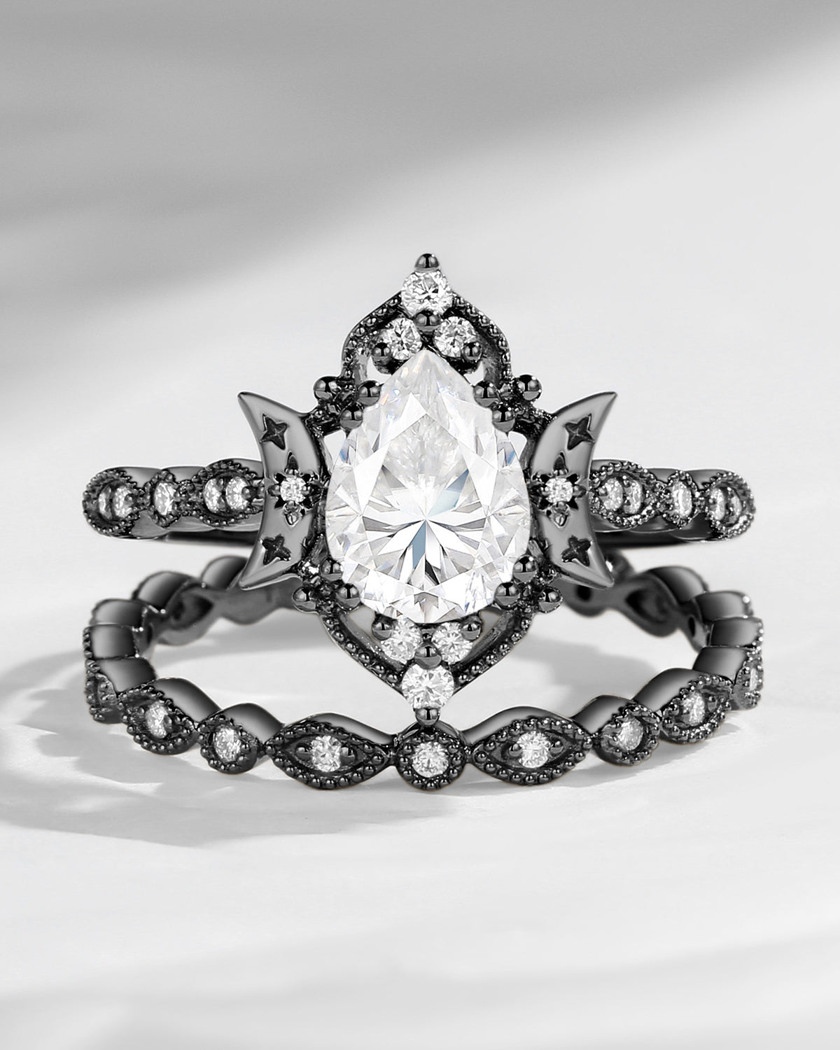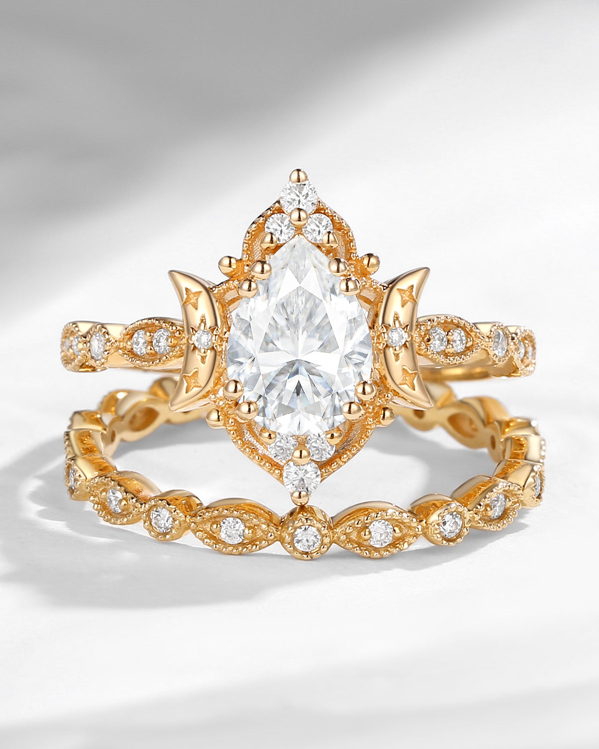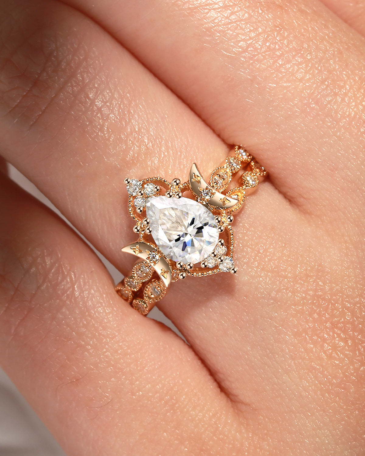 Crescent Moon | Vintage Pear Cut Moissanite 'Moons & Stars' Engagement Ring 2pcs