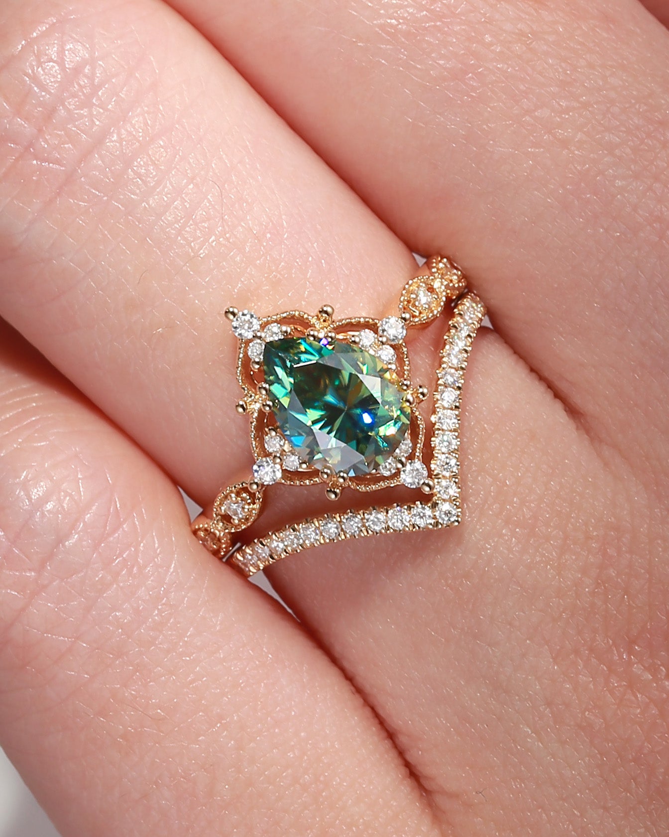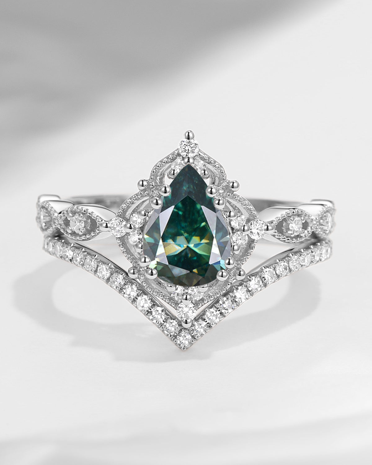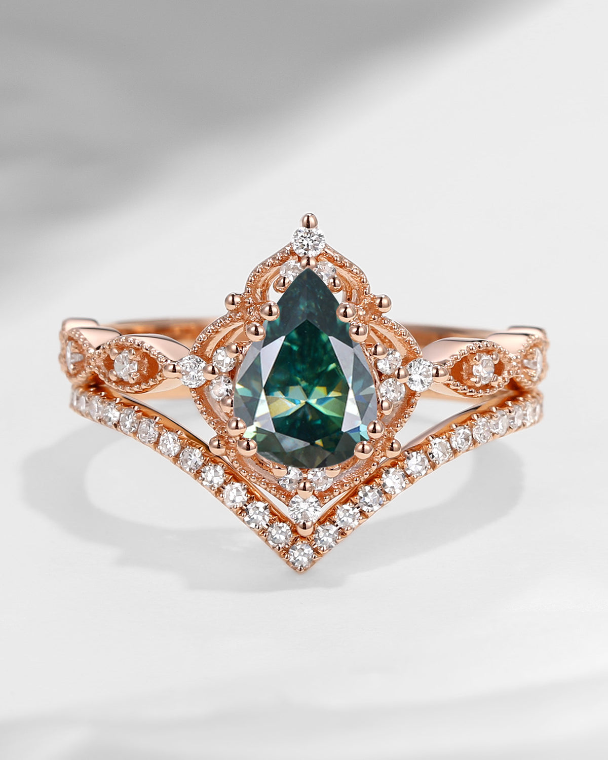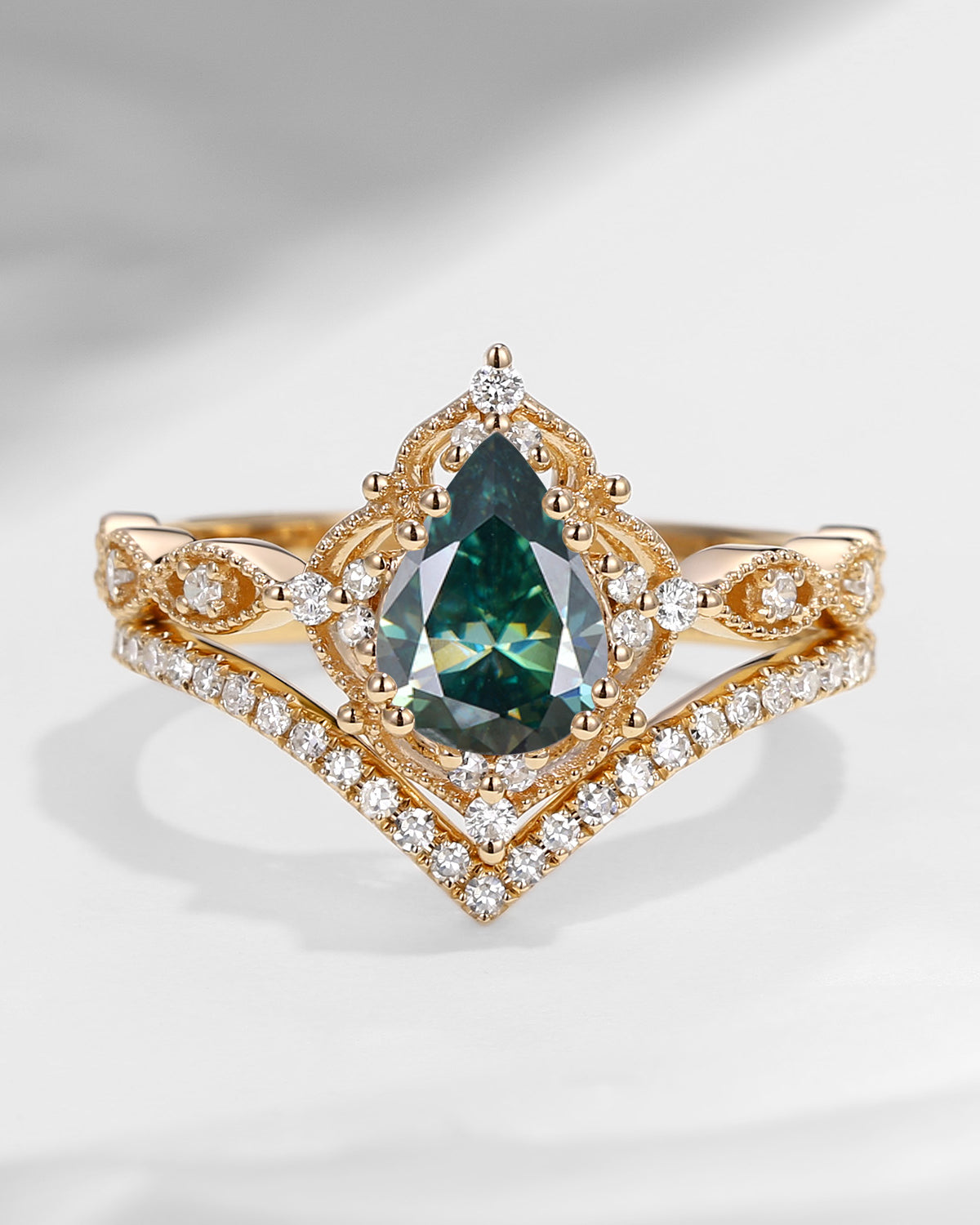 Pear Shaped Teal Blue Green Moissanite Engagement Ring Set 2pcs - Evelyn