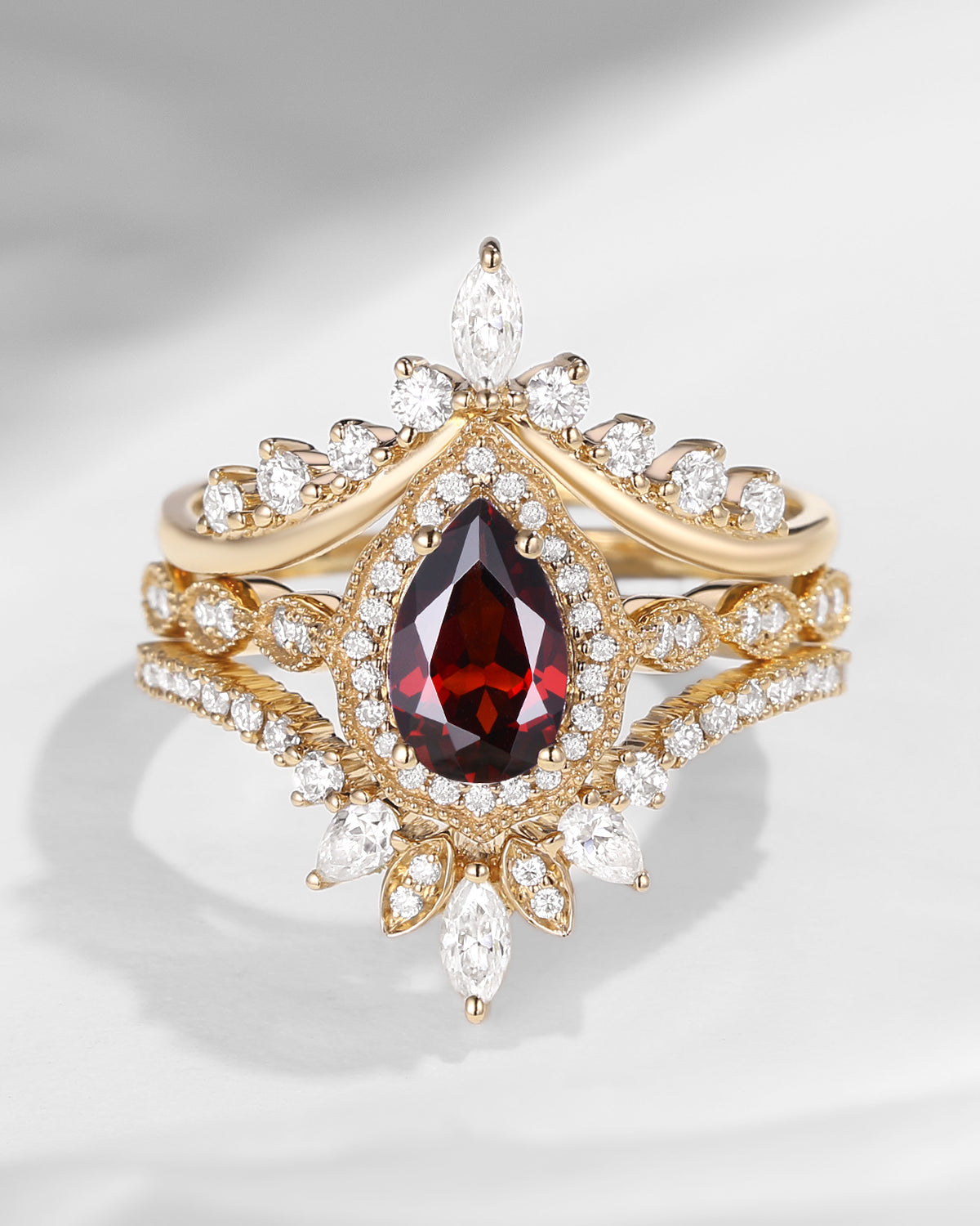 Vintage Inspired Pear Shaped Garnet Engagement Ring Set 3pcs - Diva