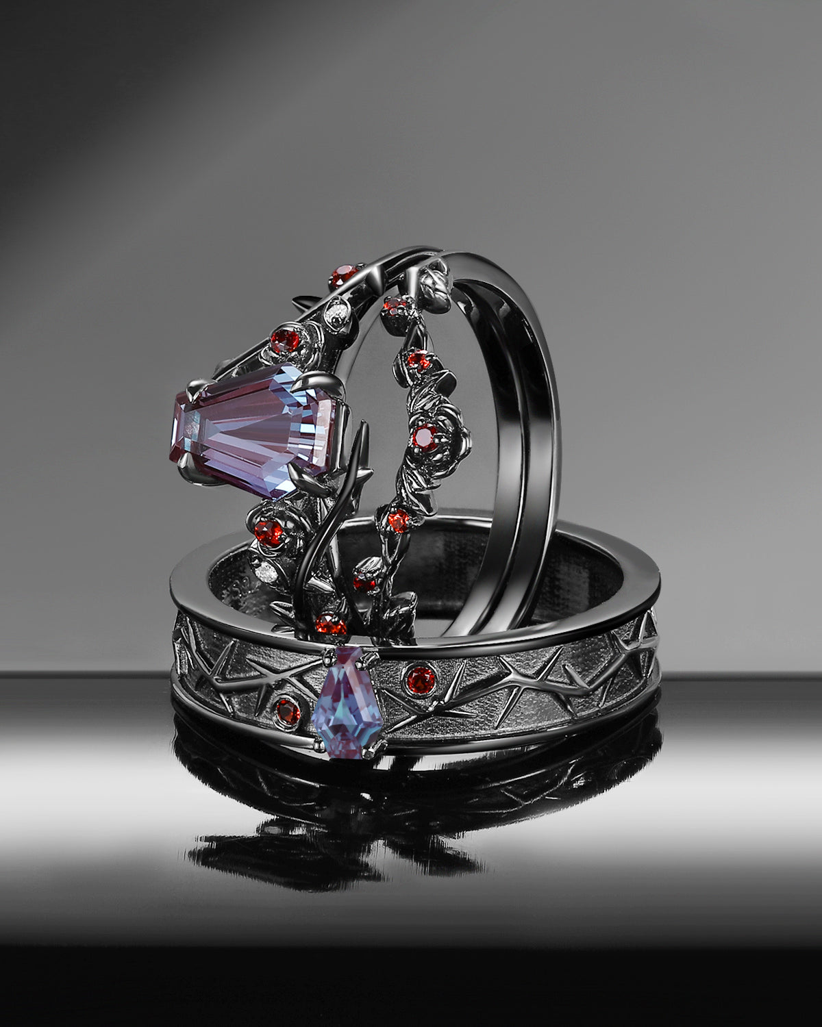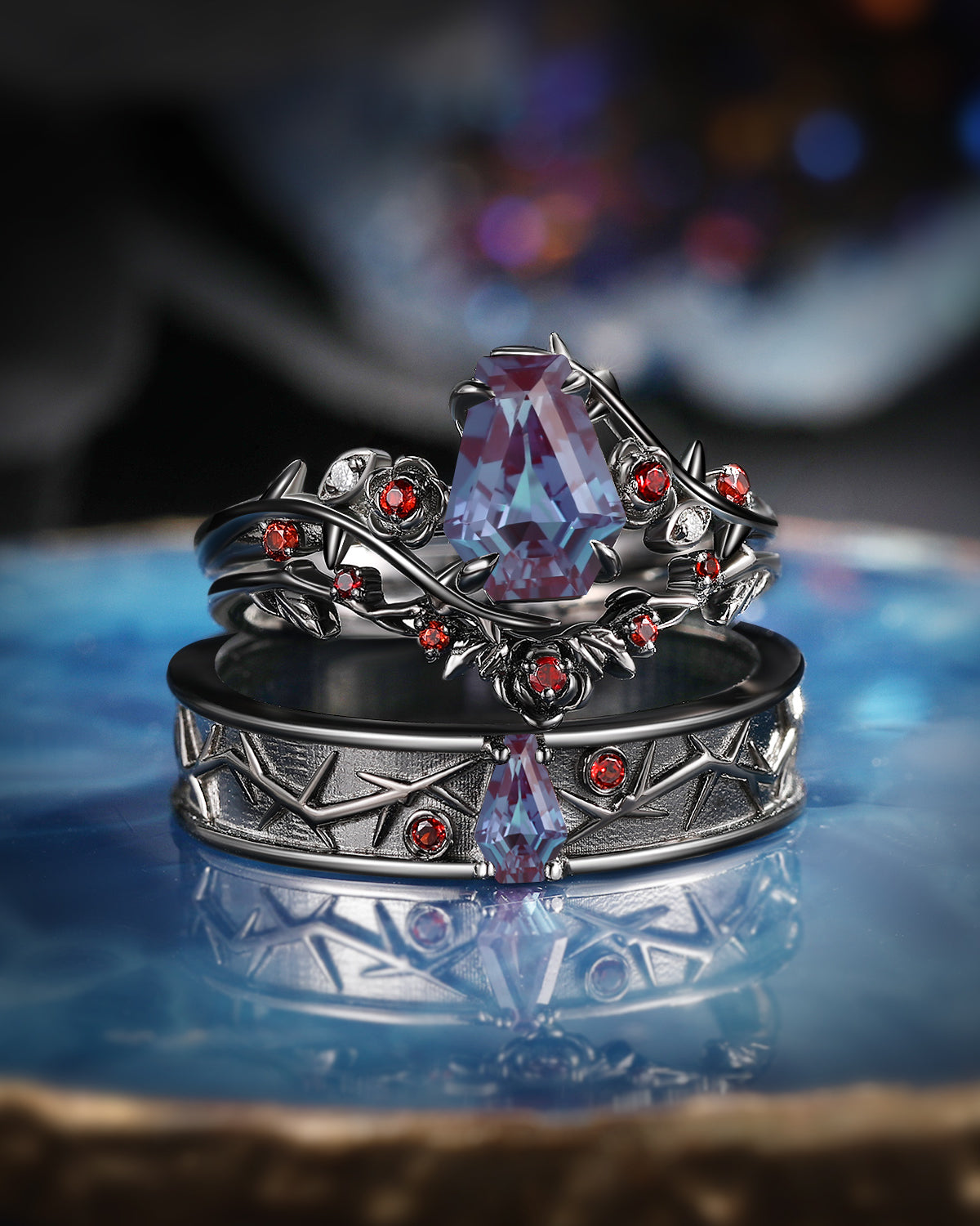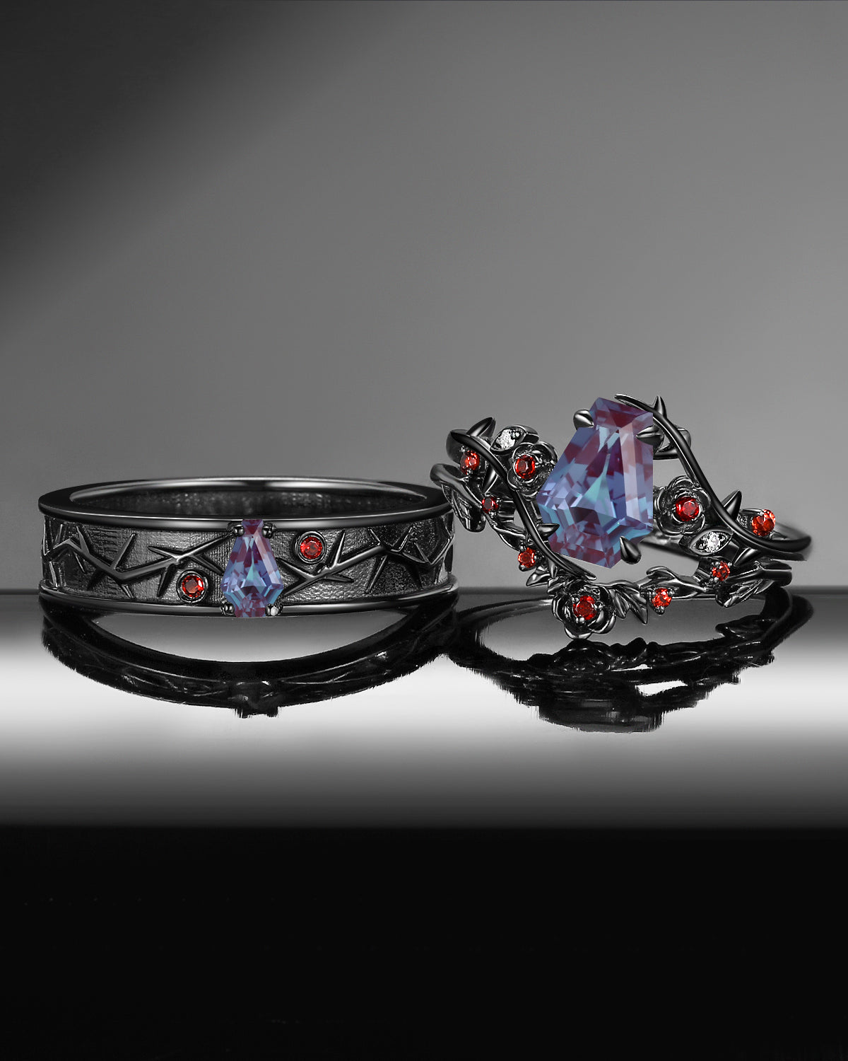 Nature Inspired Gothic Style Coffin Alexandrite 'Thorns & Roses' Couple Ring Set
