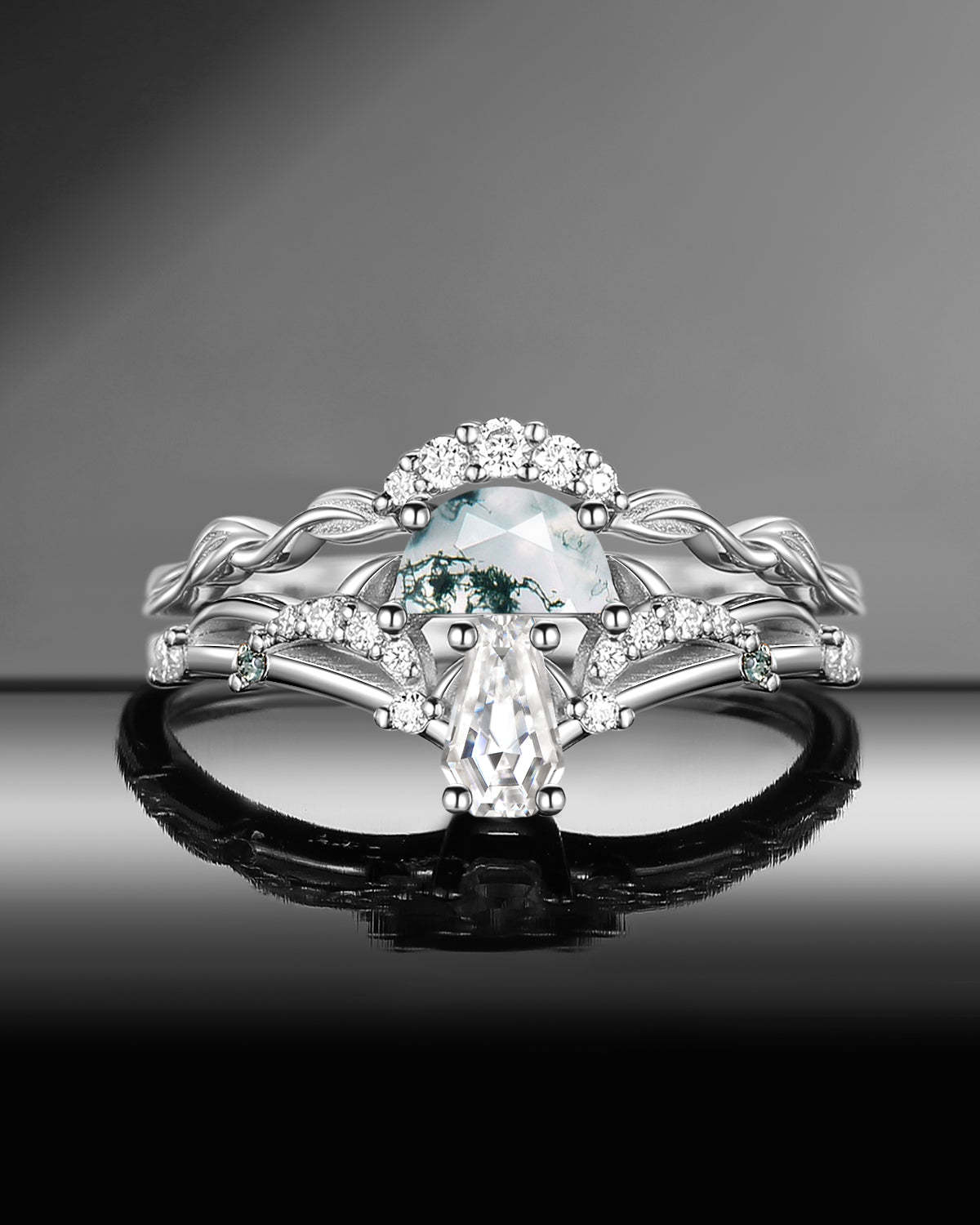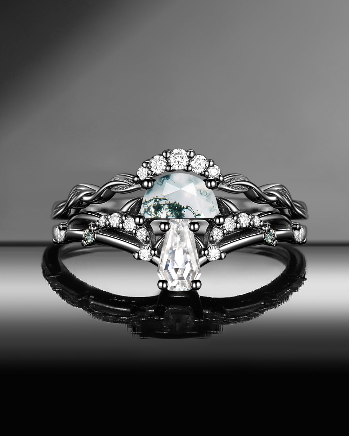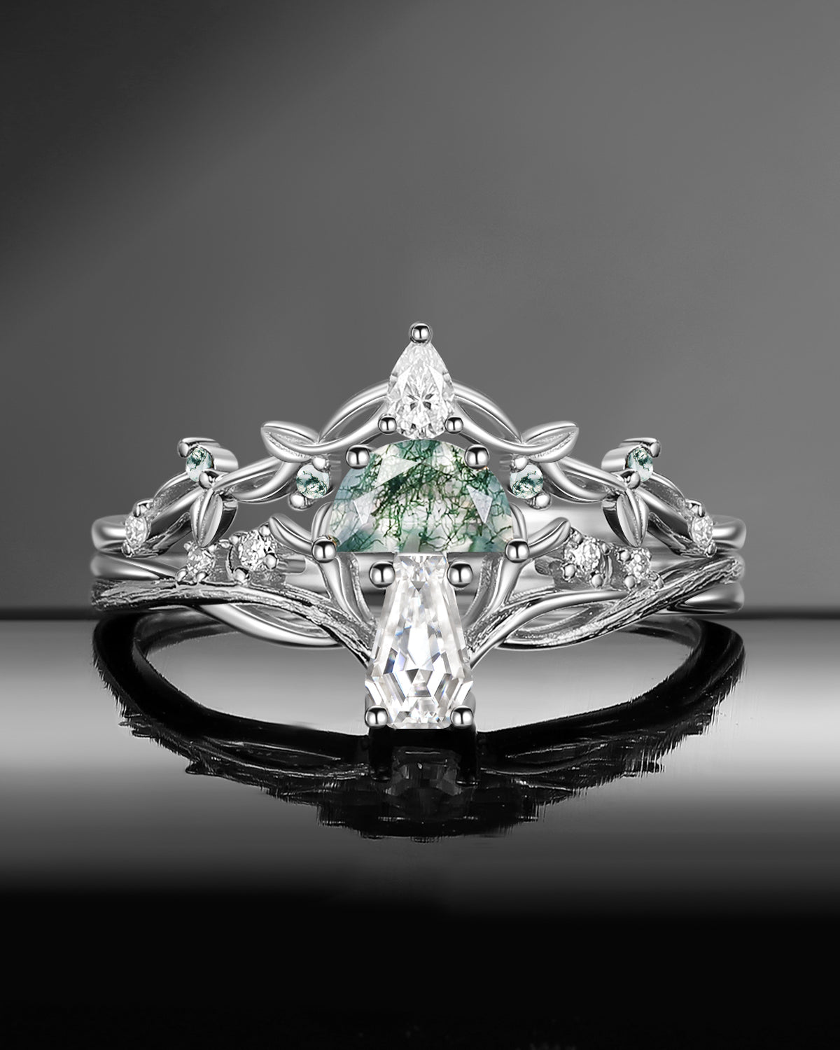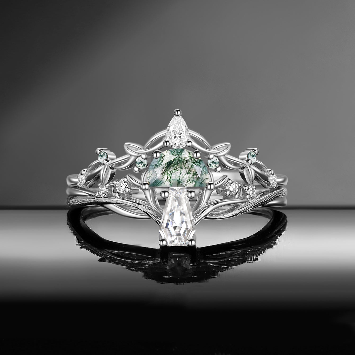 Half Moon Moss Agate + Coffin Cut Moissanite 'Tree of Life' Mushroom Engagement Ring Set 2pcs