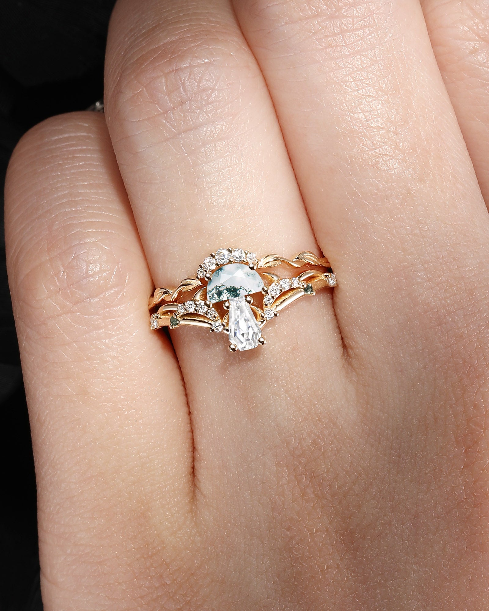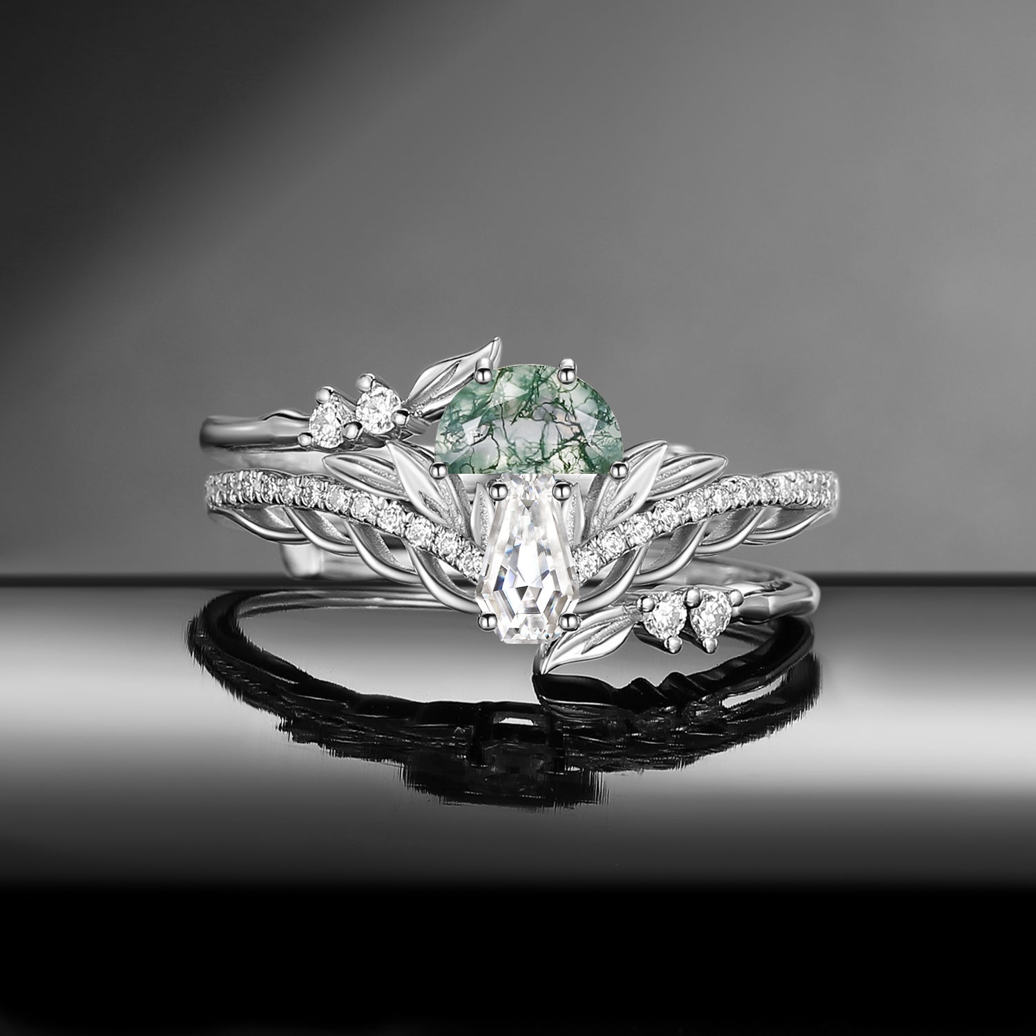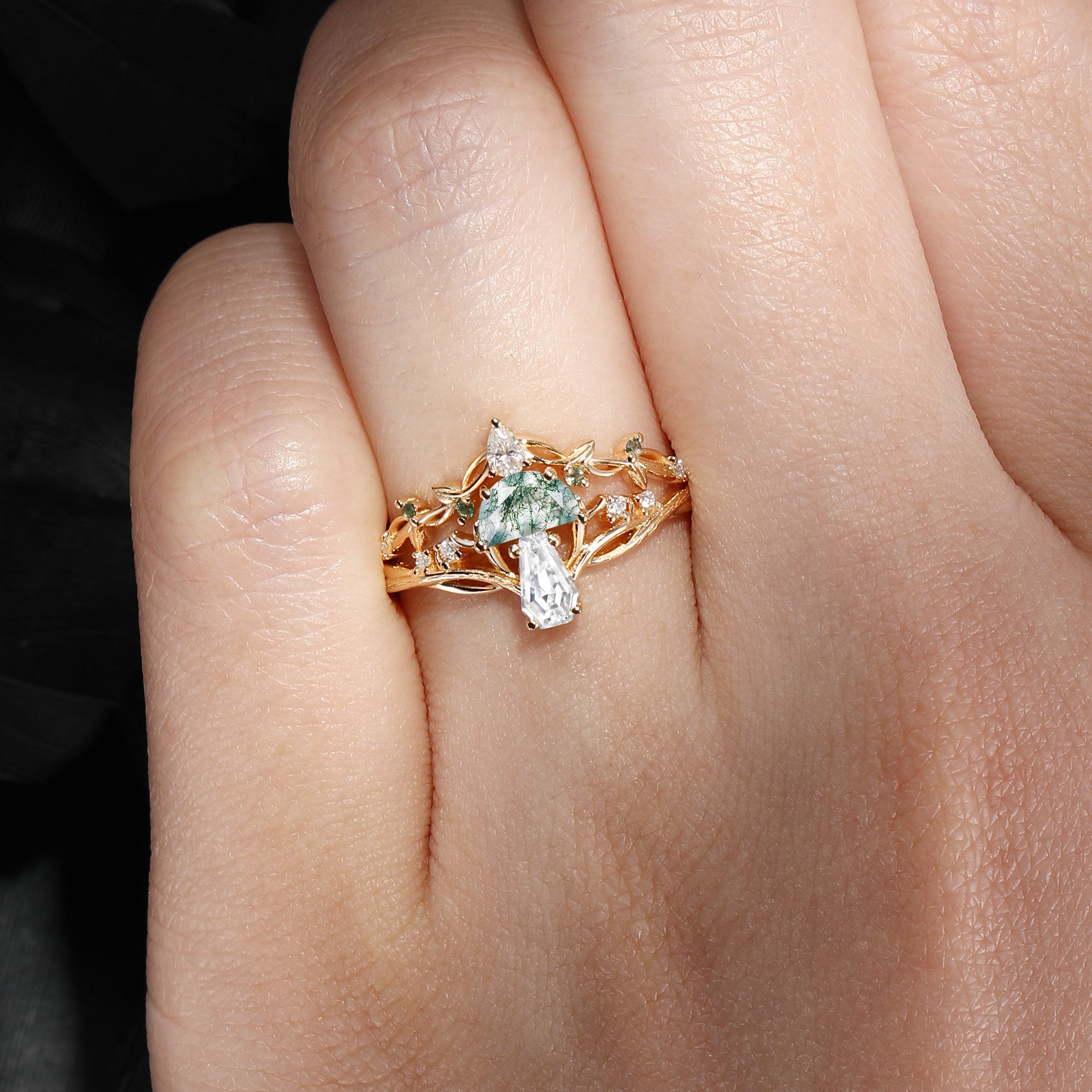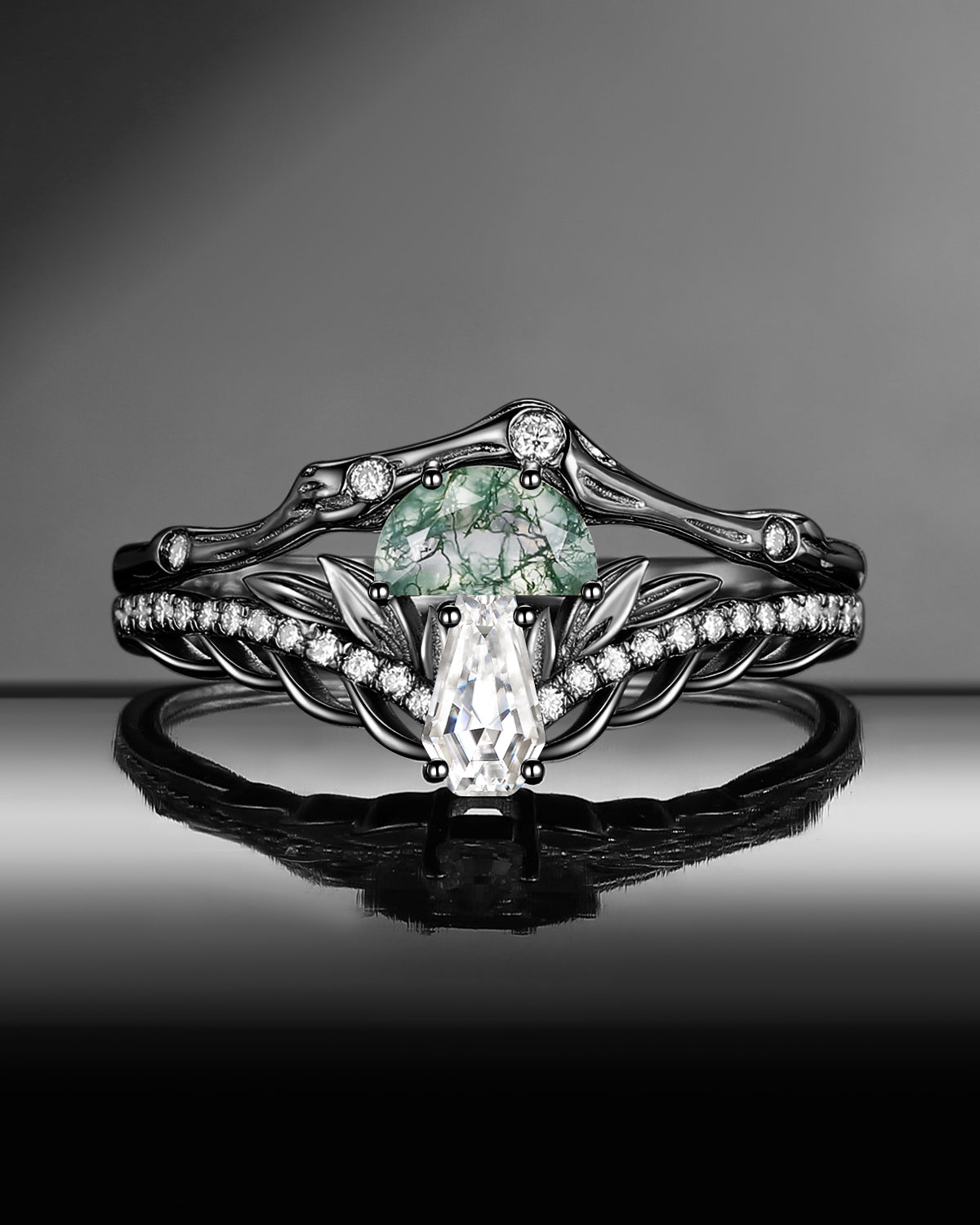 Half Moon Moss Agate + Coffin Cut Moissanite 'Tree of Life' Mushroom Engagement Ring Set 2pcs