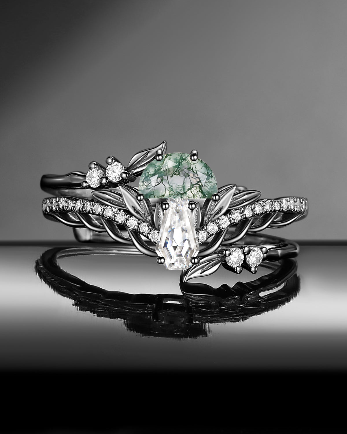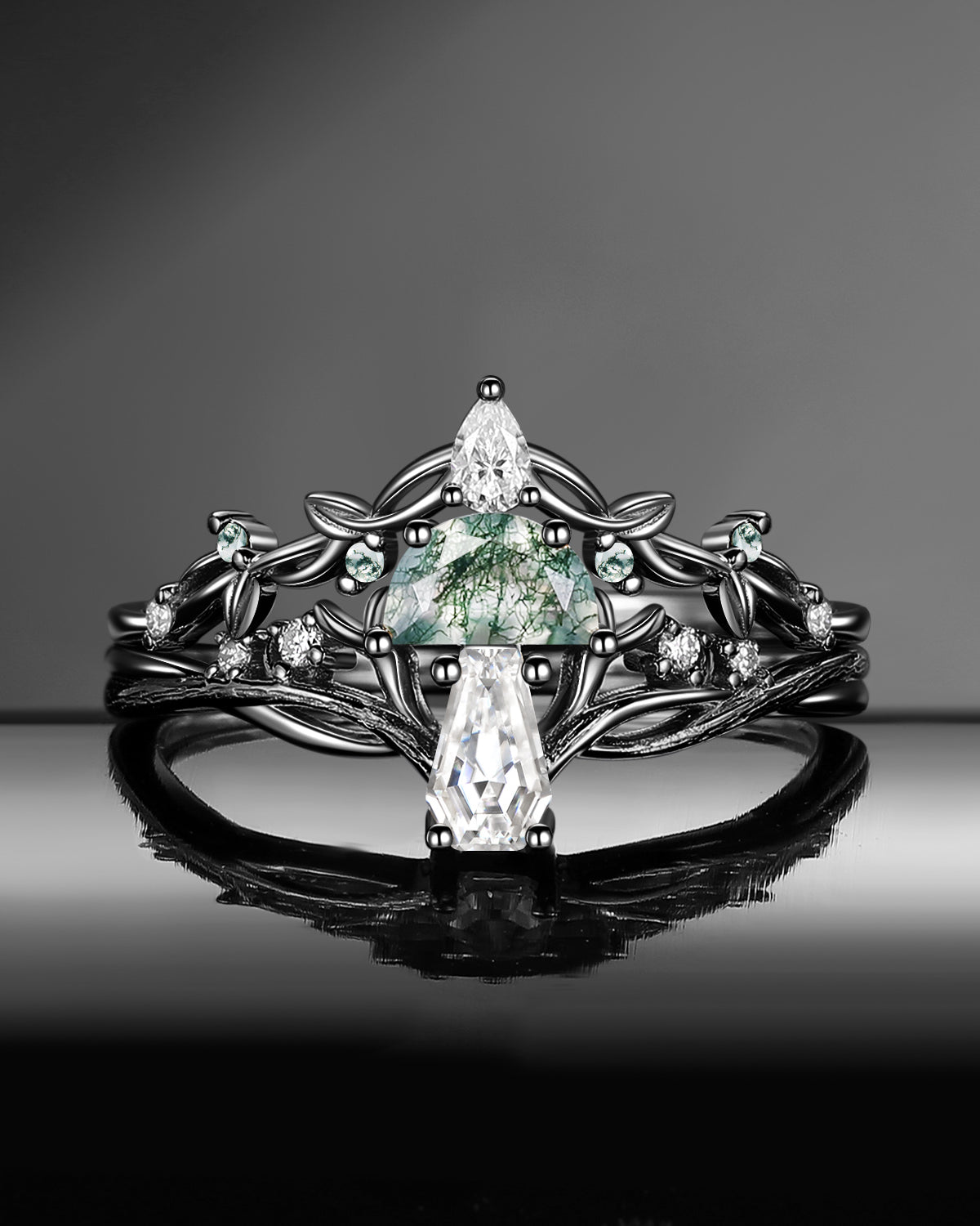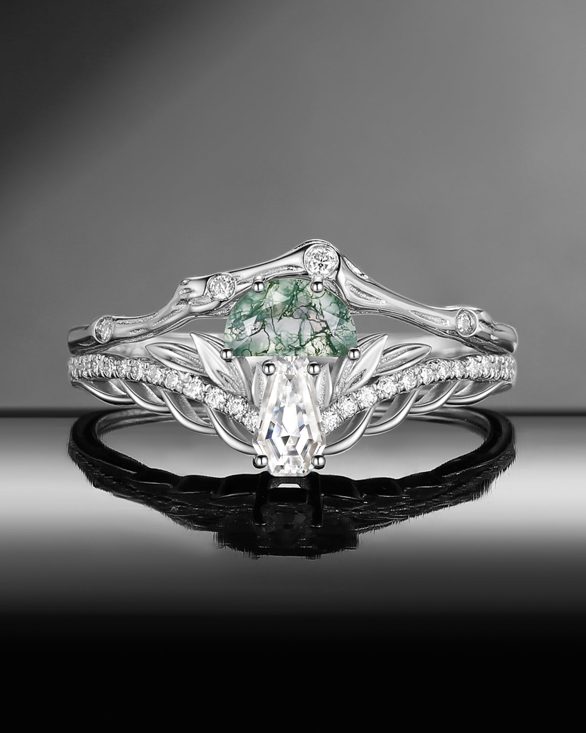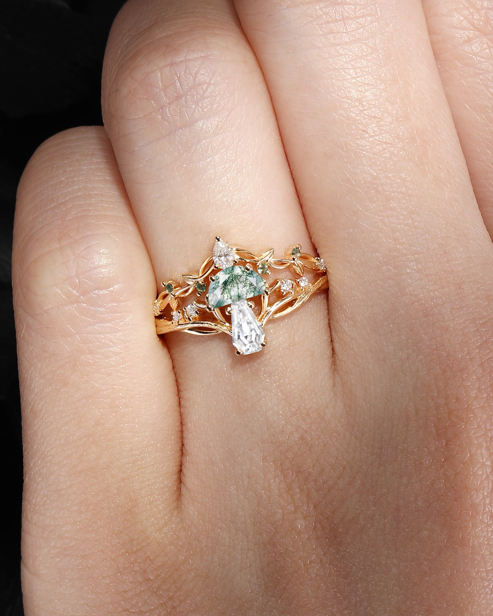 Half Moon Moss Agate + Coffin Cut Moissanite 'Tree of Life' Mushroom Engagement Ring Set 2pcs