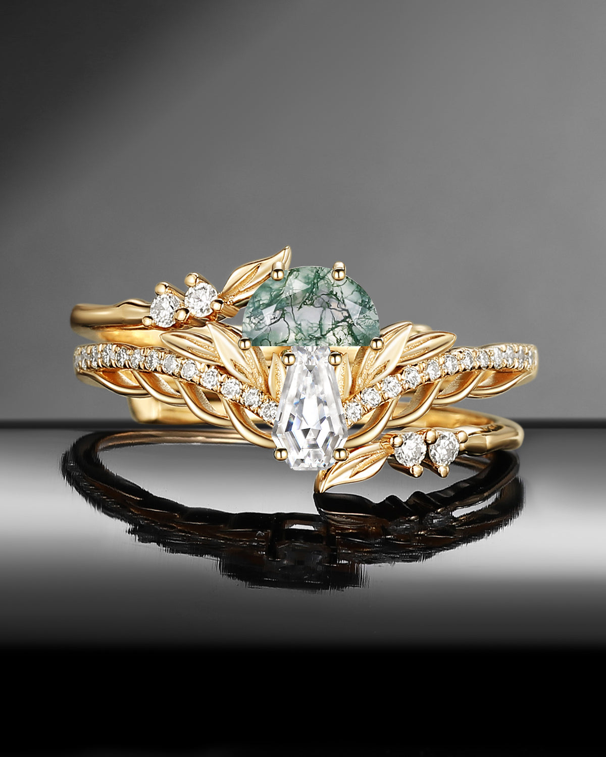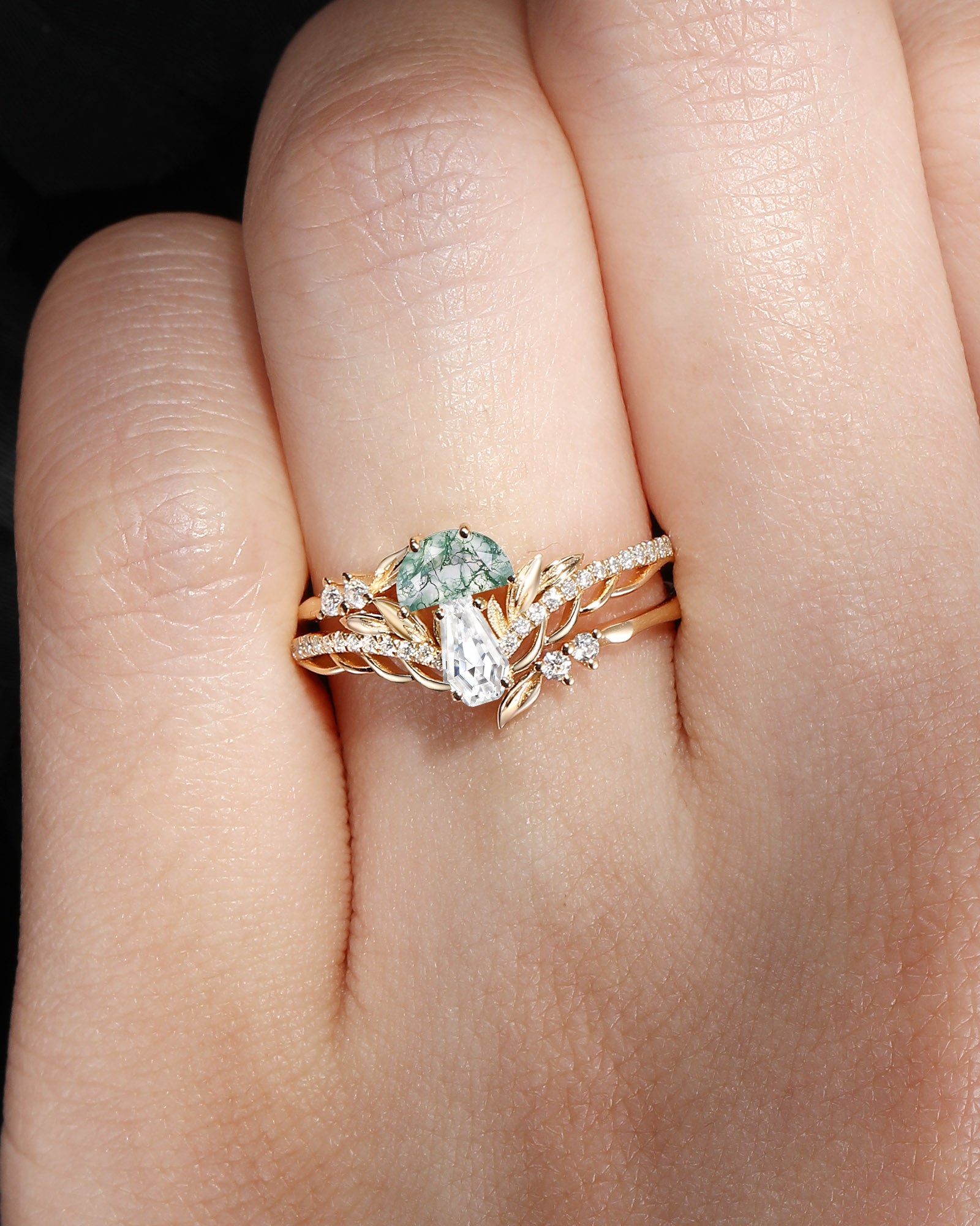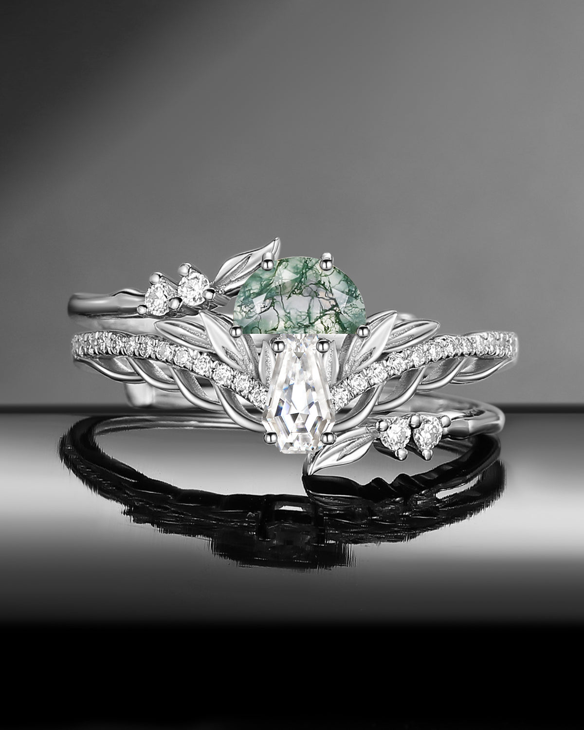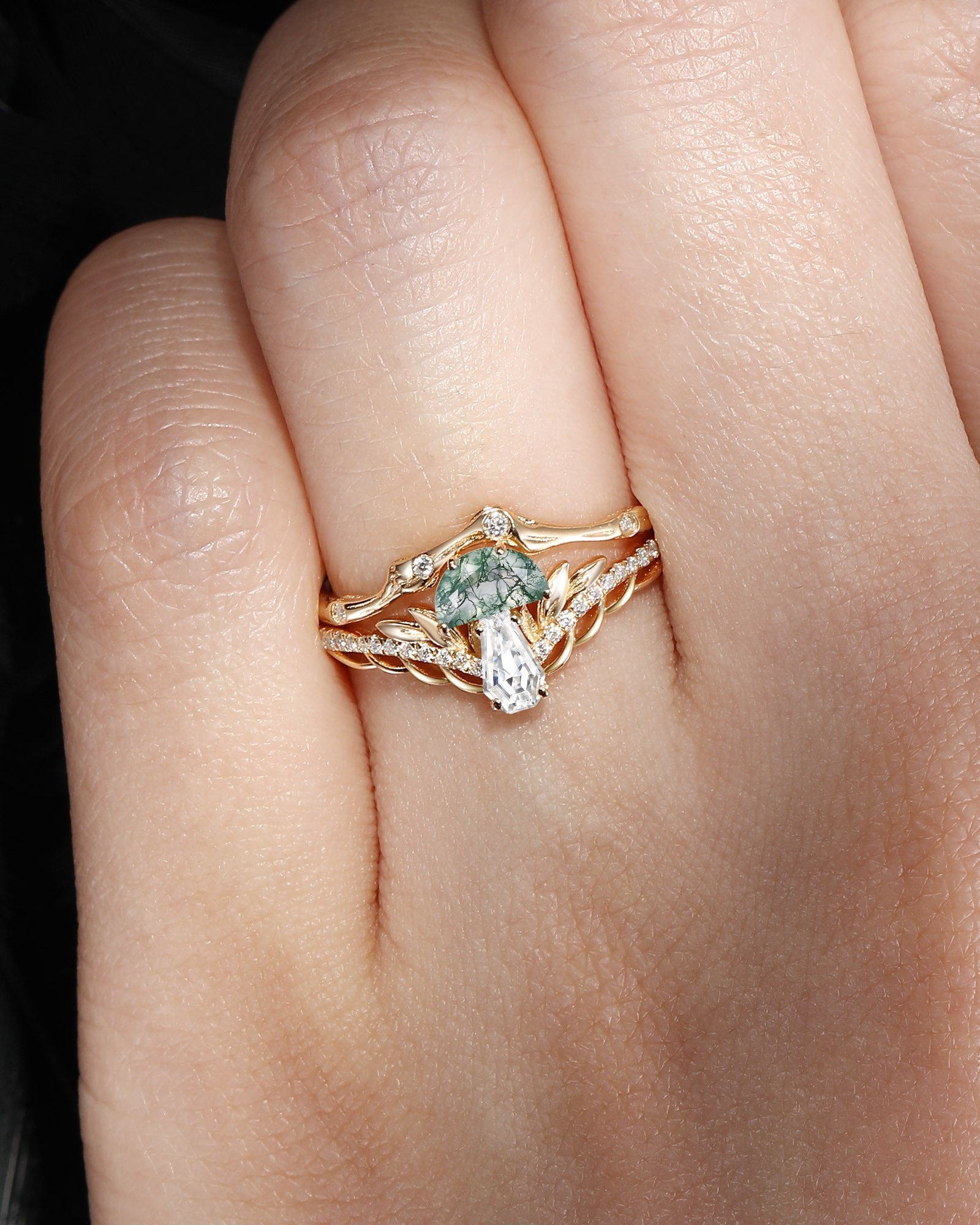 Half Moon Moss Agate + Coffin Cut Moissanite 'Tree of Life' Mushroom Engagement Ring Set 2pcs