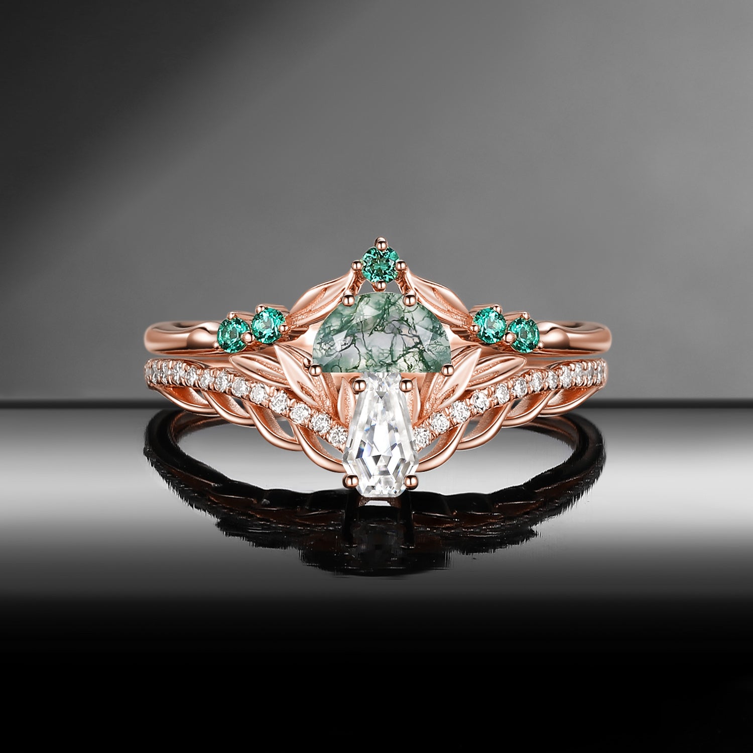 Unique Symbolic 'Tree of Life' Half Moon Moss Agate & Coffin Moissanite Mushroom Engagement Ring Set 2pcs