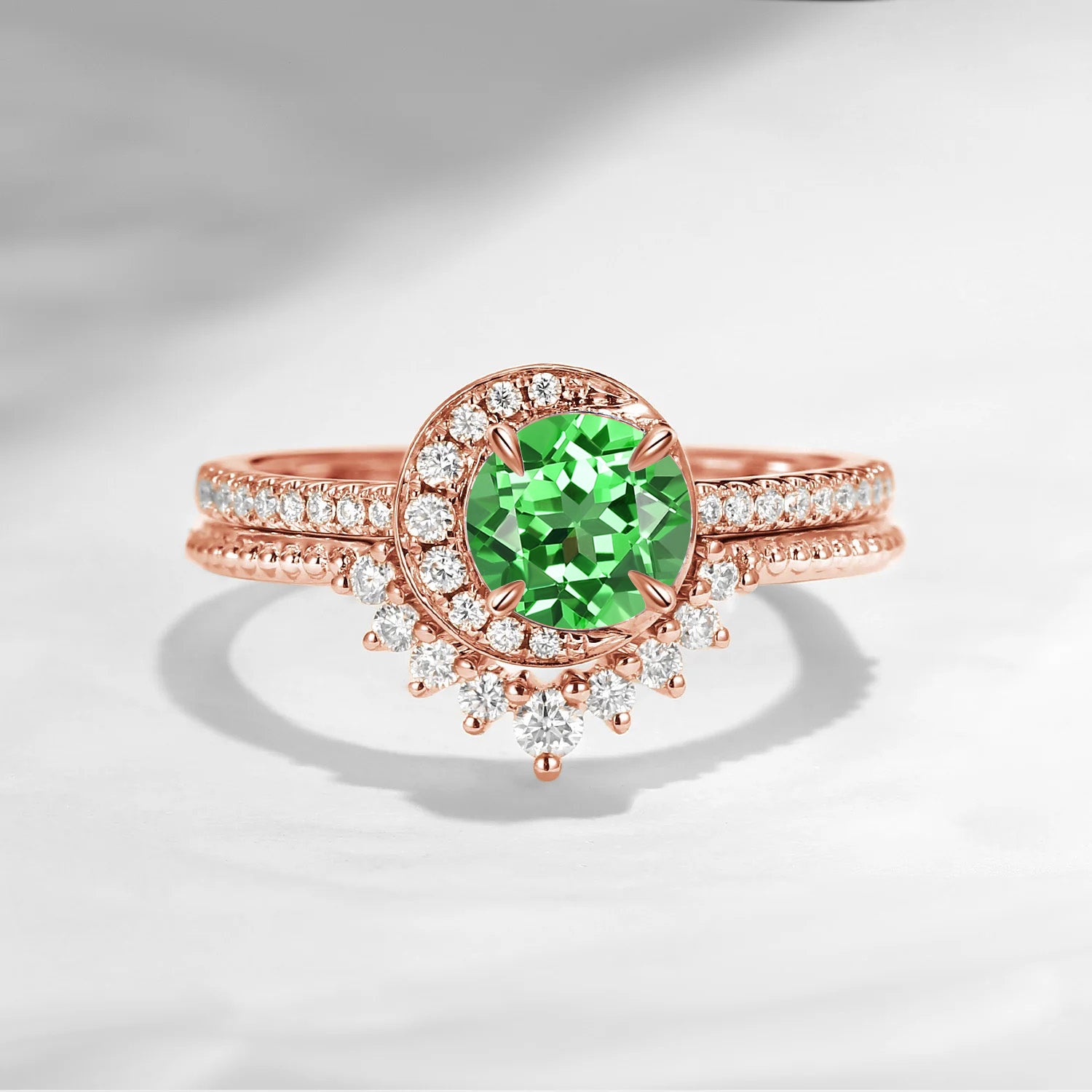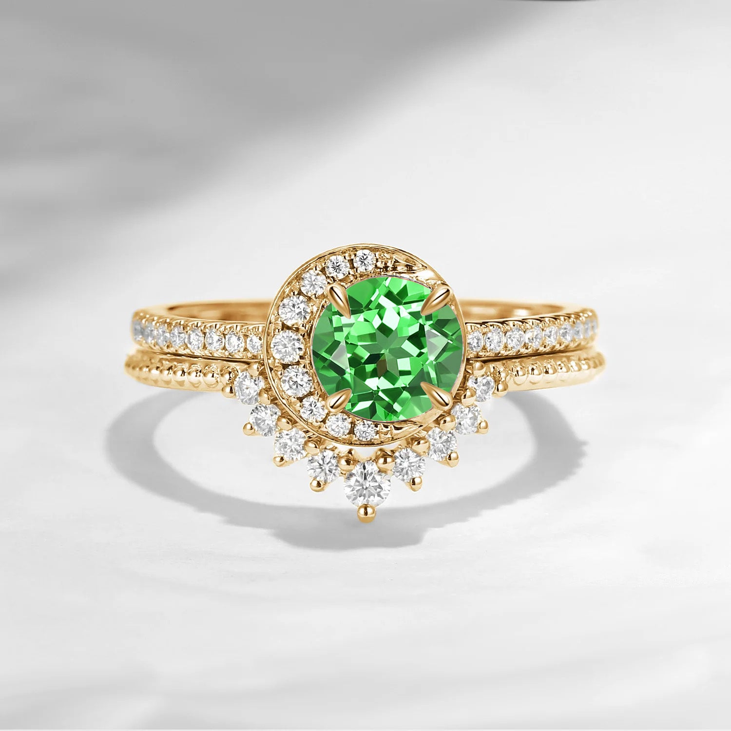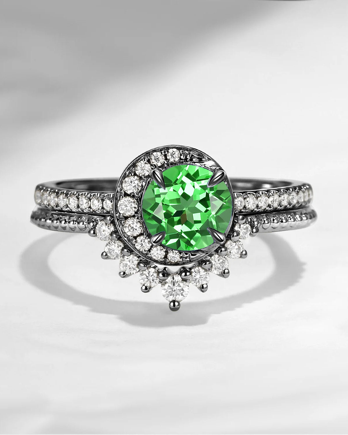 Crescent Moon | Round Lab Tsavorite Engagement Ring Set 3PCS - Full Moon