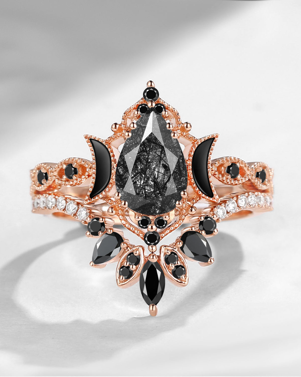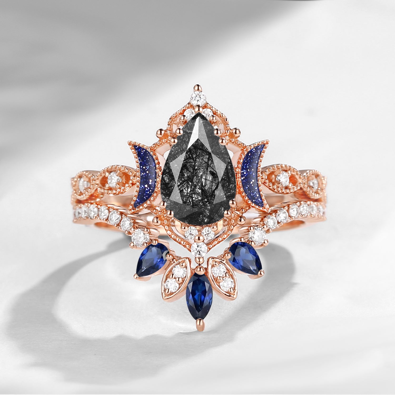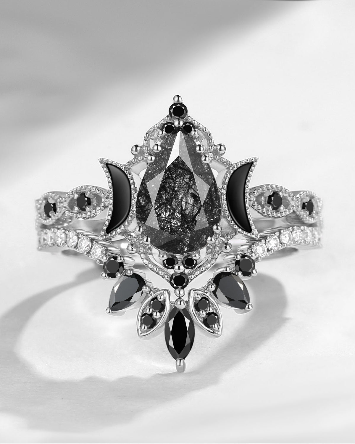 Crescent Moon | Round Lab Tsavorite Engagement Ring Set 3PCS - Full Moon
