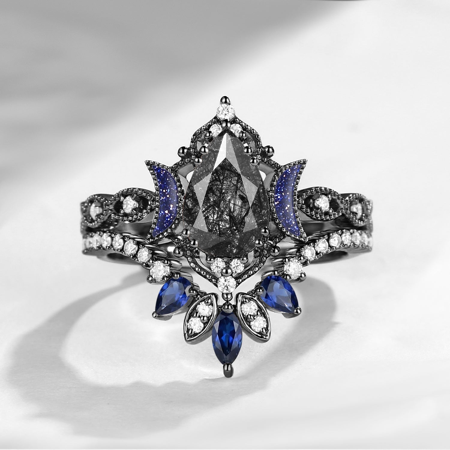 Coffin Cut Lab Tsavorite Vintage Black Gold Bridal Set 2pcs - Bat Ring
