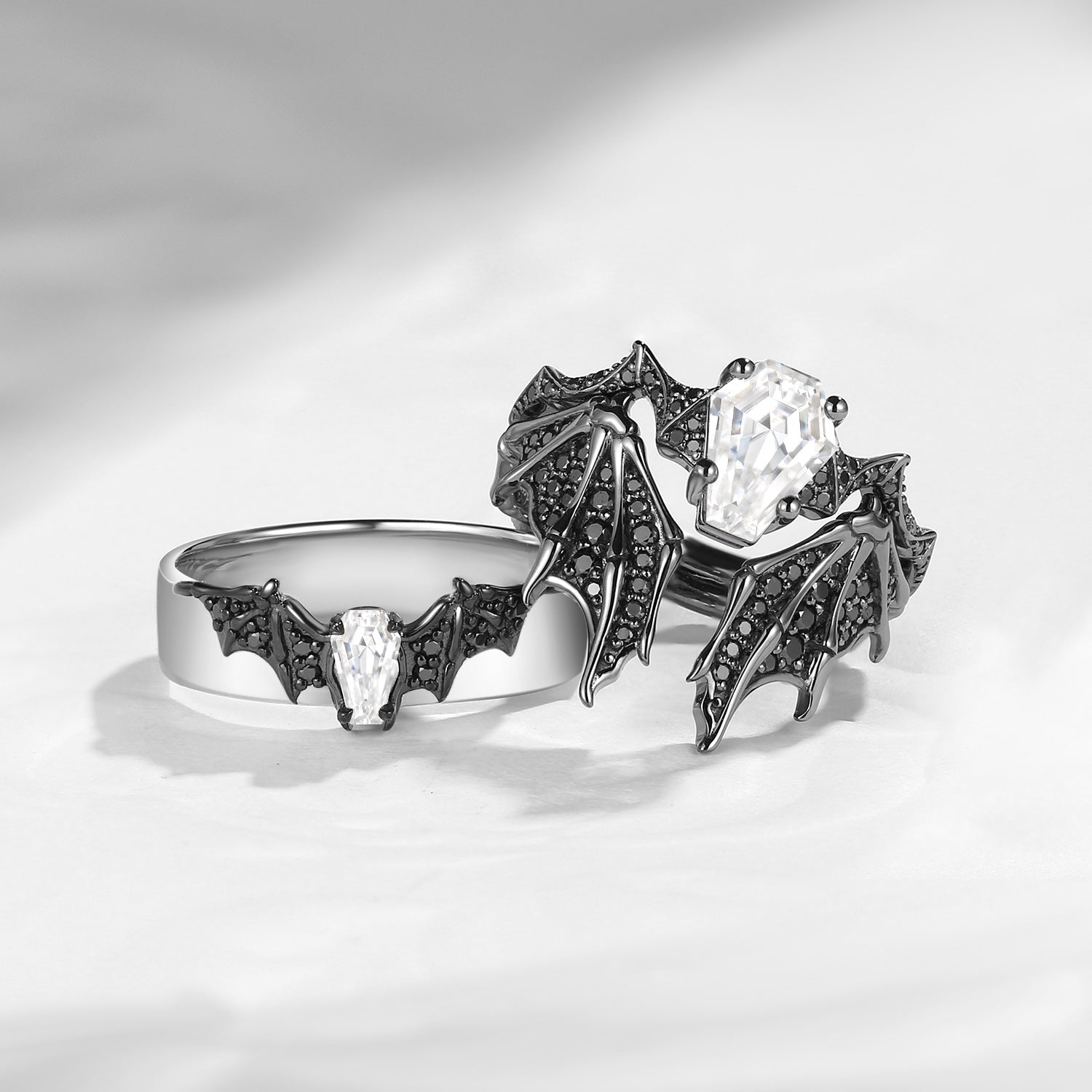 Bat Wing Inspired Coffin Moissanite Couple Bridal Ring Set