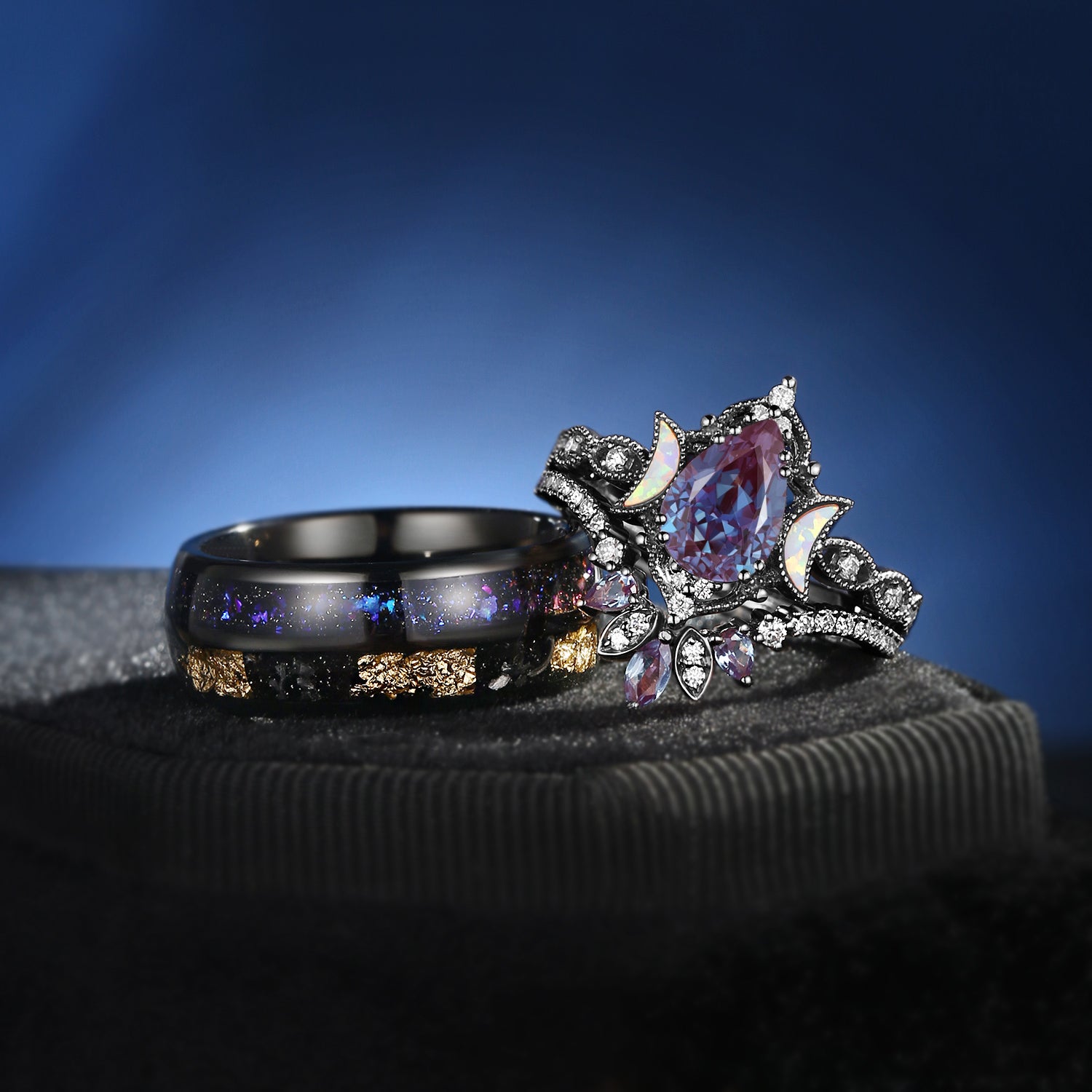 Crescent Moon | Pear Cut Lab Alexandrite 'Ultra Galaxy' / Double Electroplated Couple Bridal Ring Set