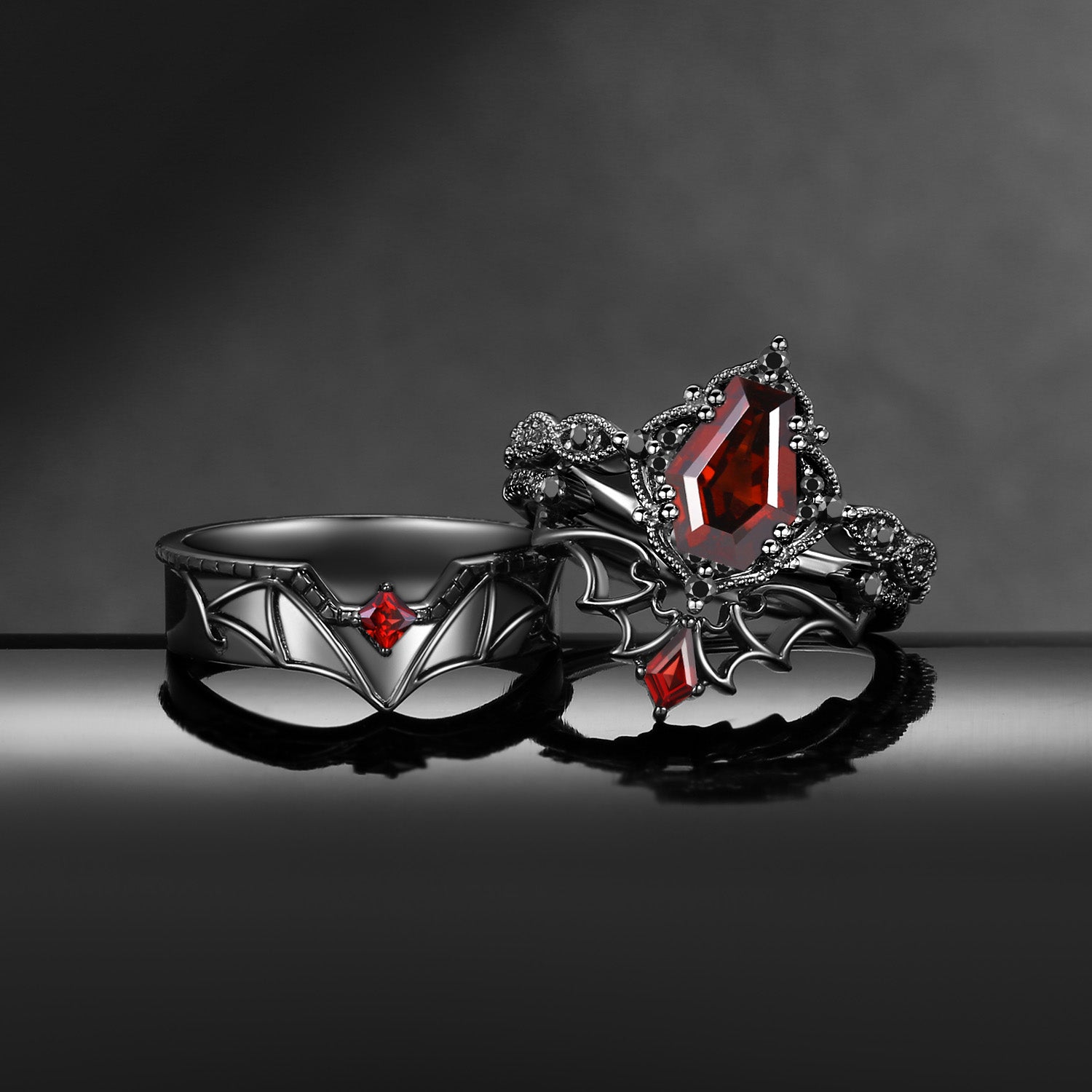 Gothic Coffin Garnet Bat Wing Inspired Couple Bridal Ring Set