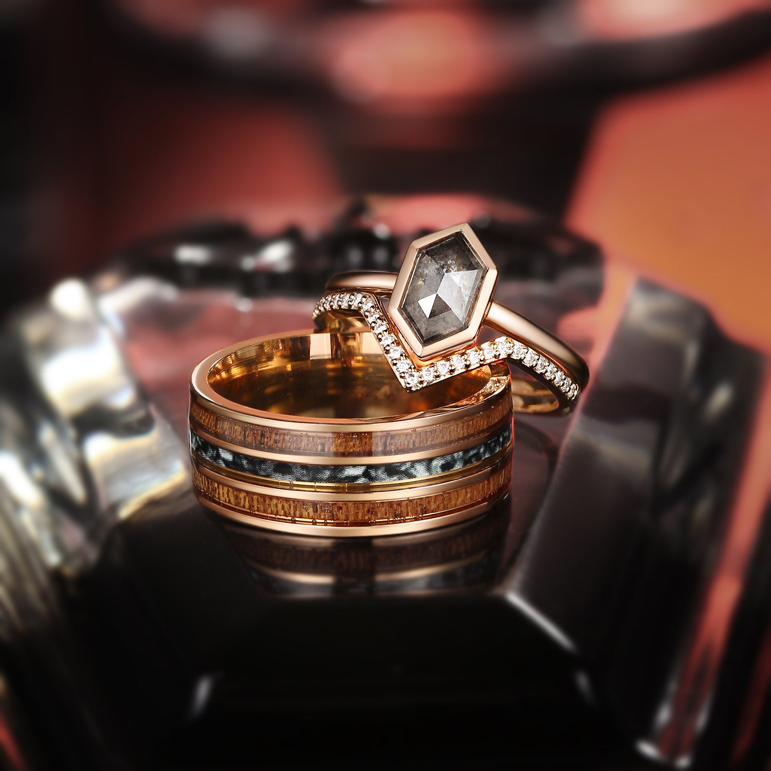 Long Hexagon Salt And Pepper Diamond Bezel Ring / Wooden Electroplated Band Couple Bridal Ring Set