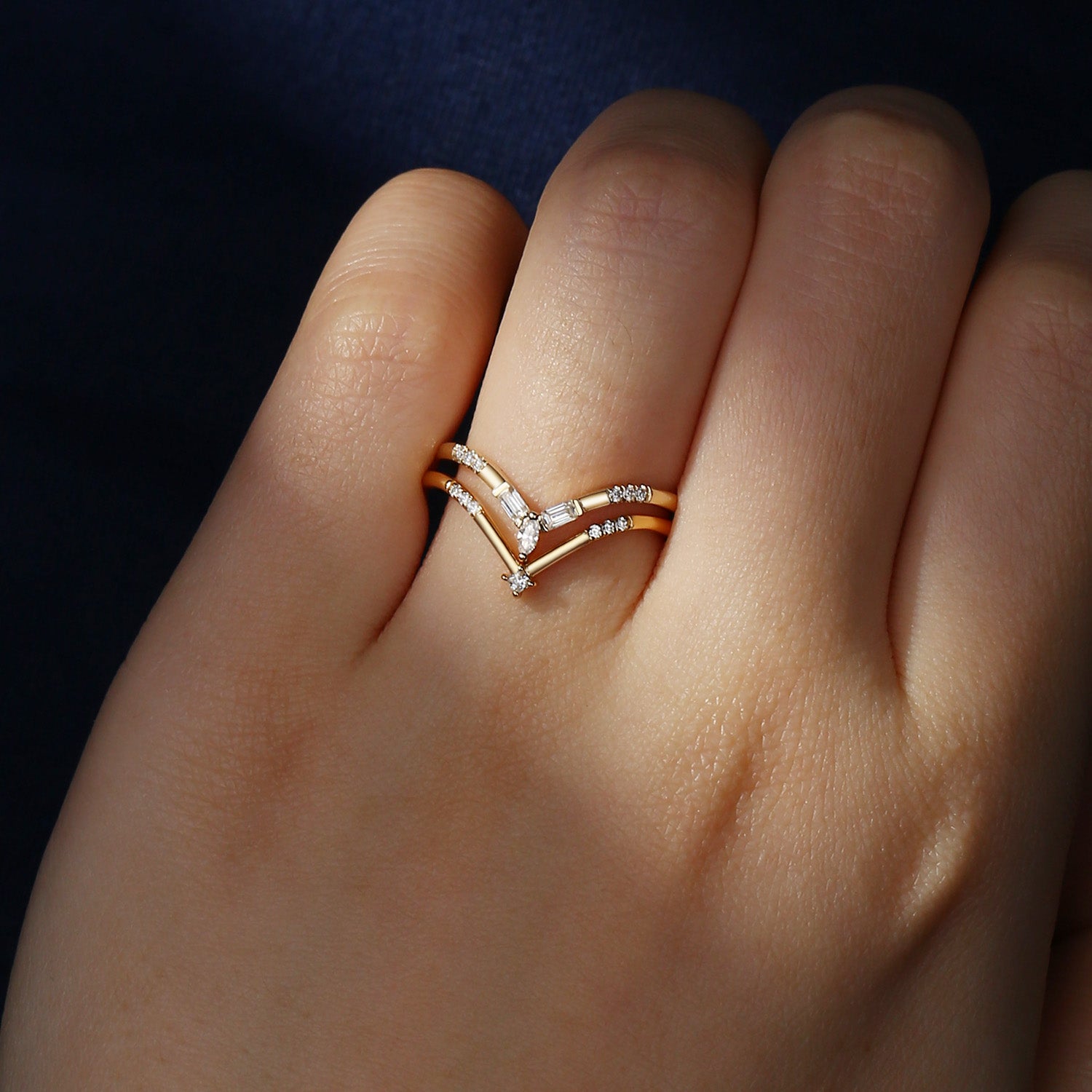 Minimalist Moissanite V shaped Wedding Band Set 2pcs