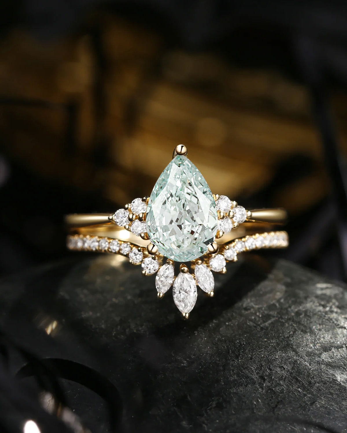 Pear Shaped Lab Green Diamond Antique Stacking Engagement Ring 2pcs - Evelyn