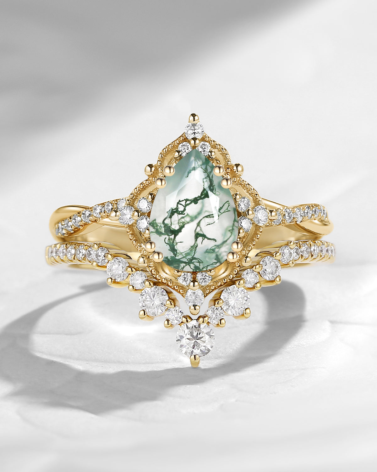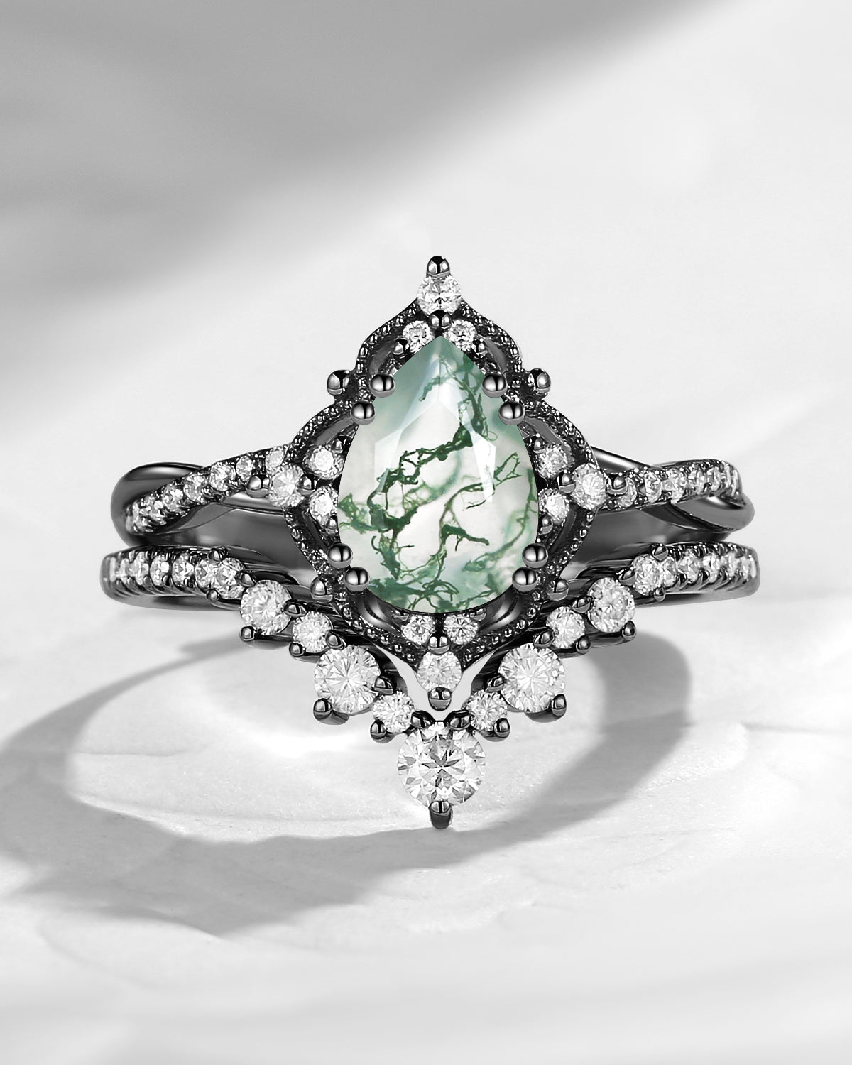 Crescent Moon | Pear Cut Moss Agate 'Ultra Galaxy' Engagement Ring Set 2pcs