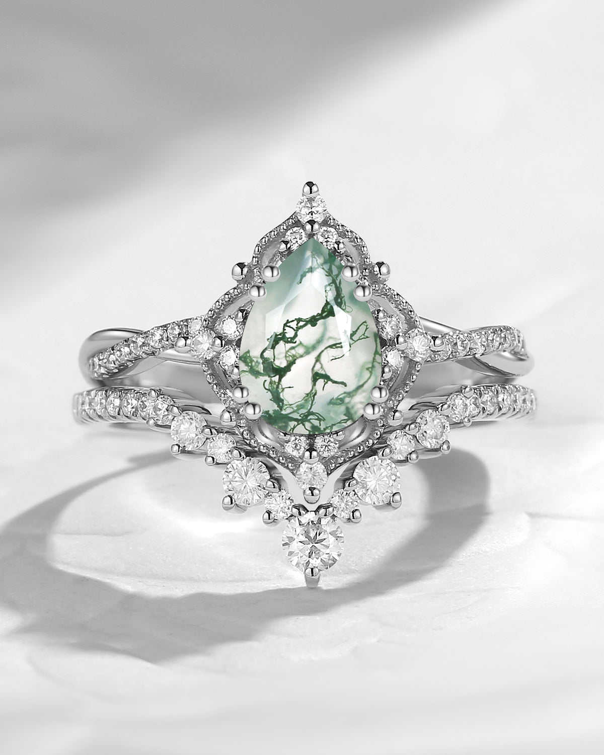 Crescent Moon | Unique Pear Shape Moss Agate Engagement Ring Set 2pcs - Luna