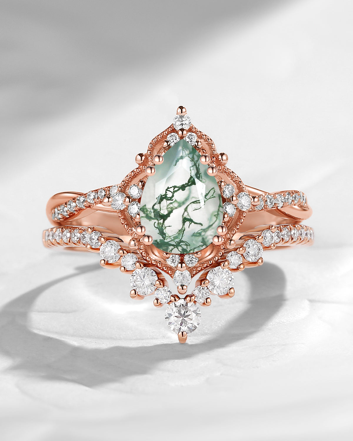 Vintage Inspired Pear Cut Moss Agate Infinity Engagement Ring 2pcs