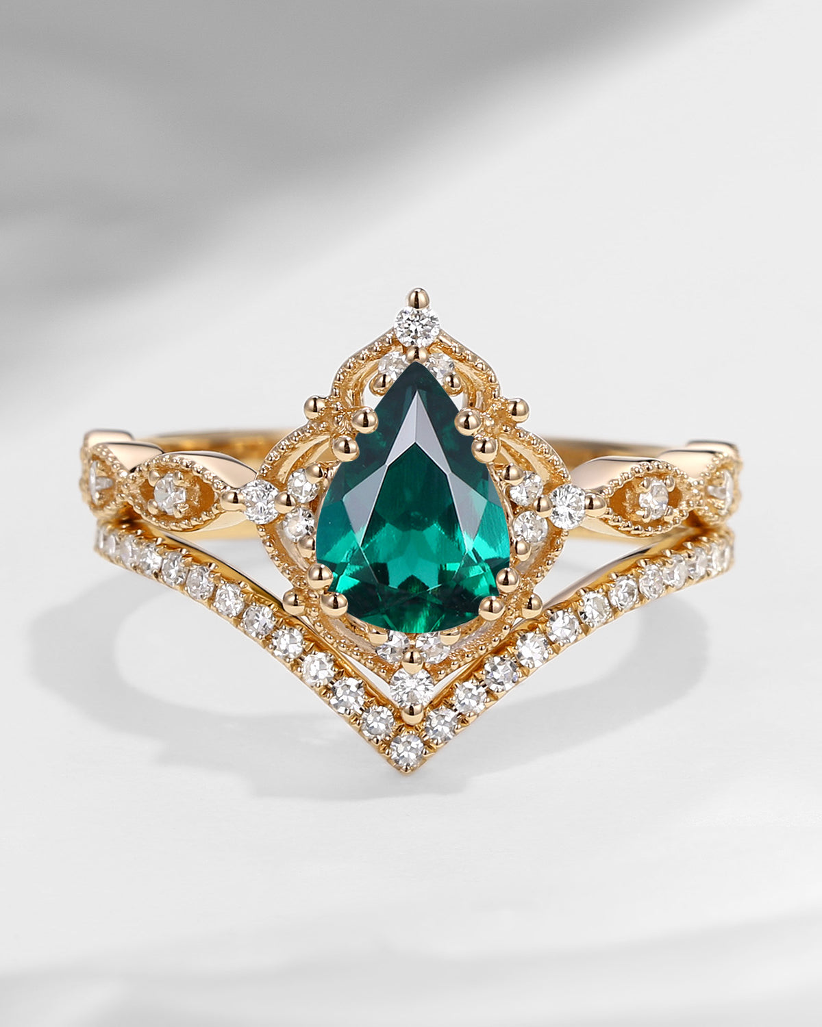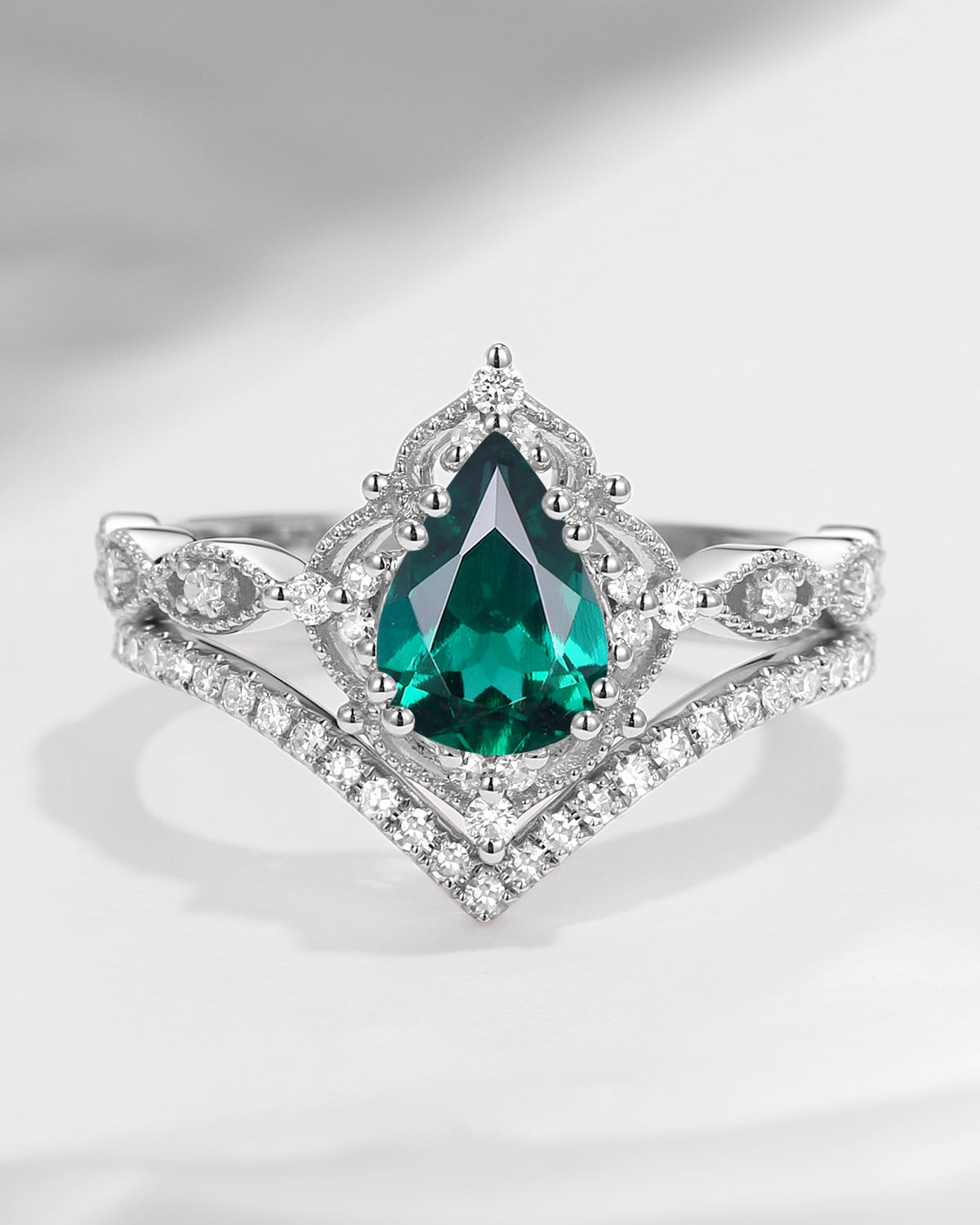 1.5ct Pear Shaped Lab Emerald Engagement Ring Set 2pcs - Evelyn