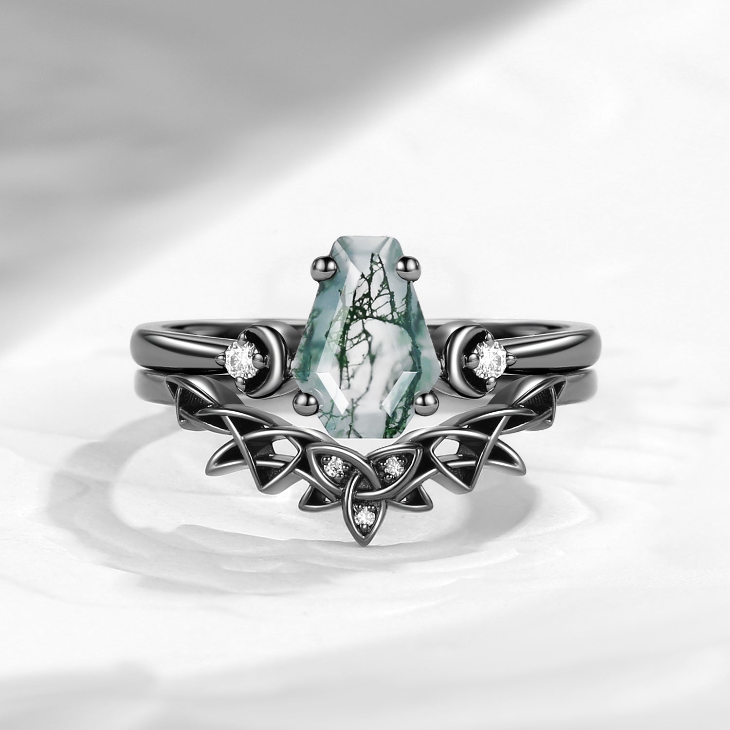 Celtic Moon | Fancy Coffin Cut Moss Agate Celtic Engagement Ring Set 2pcs
