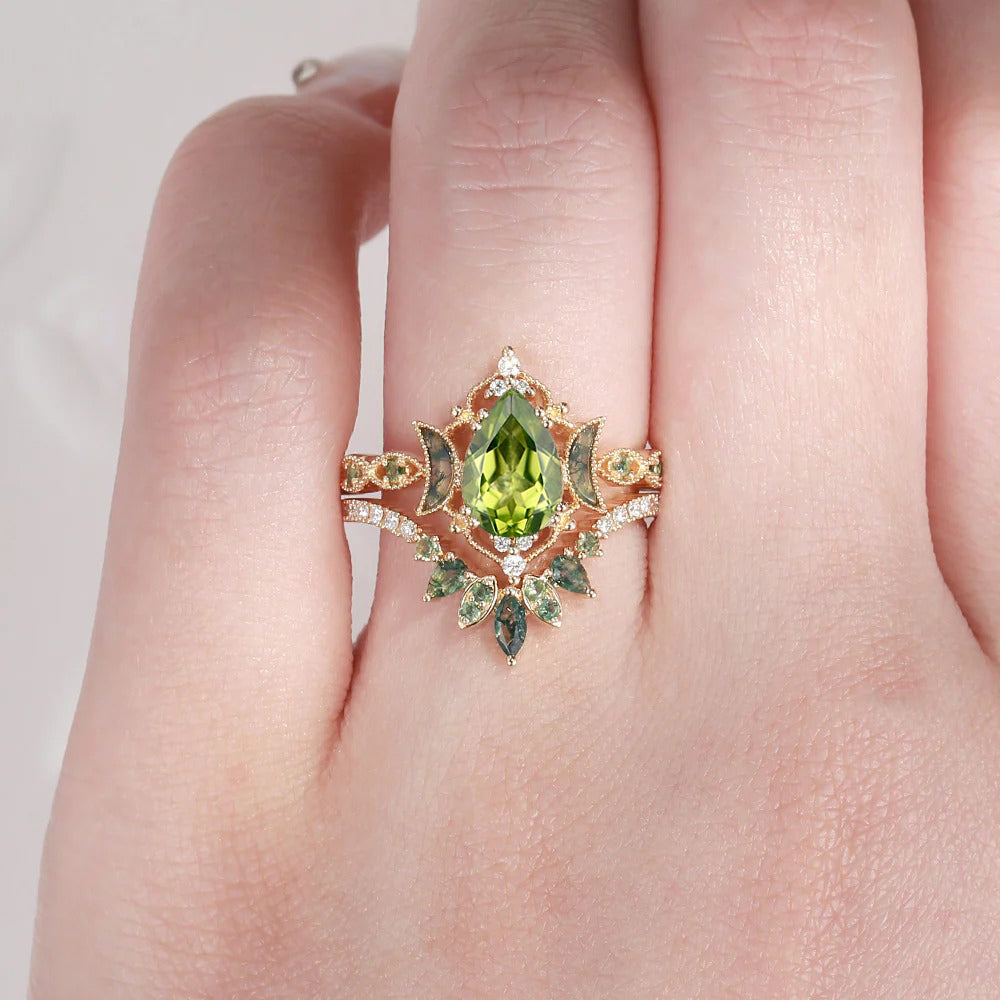 Crescent Moon | Pear Cut Peridot 'Ultra Galaxy' Engagement Ring Set 2pcs