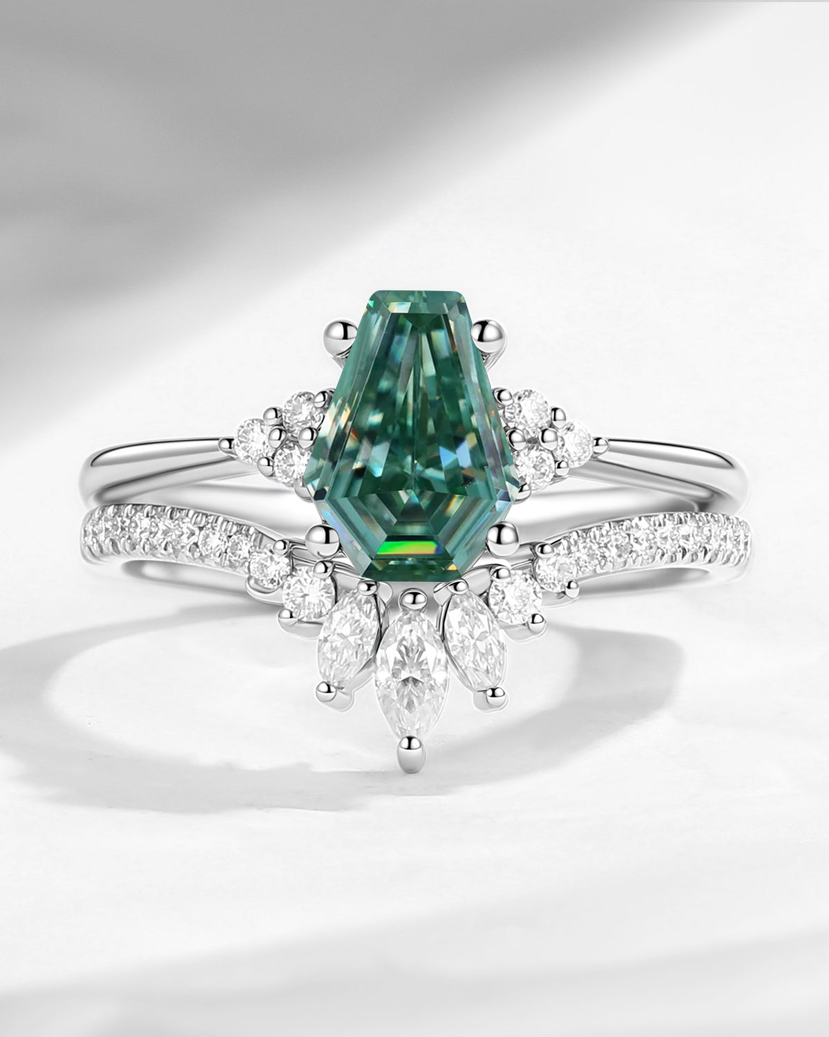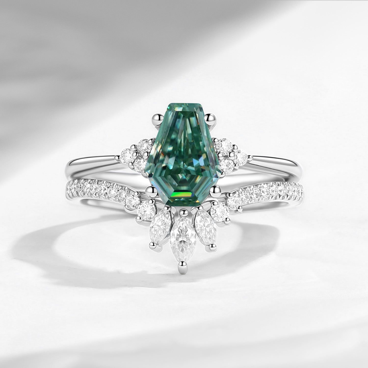 Coffin Cut Green Moissanite Cluster Engagement Set 2pcs - White Dress