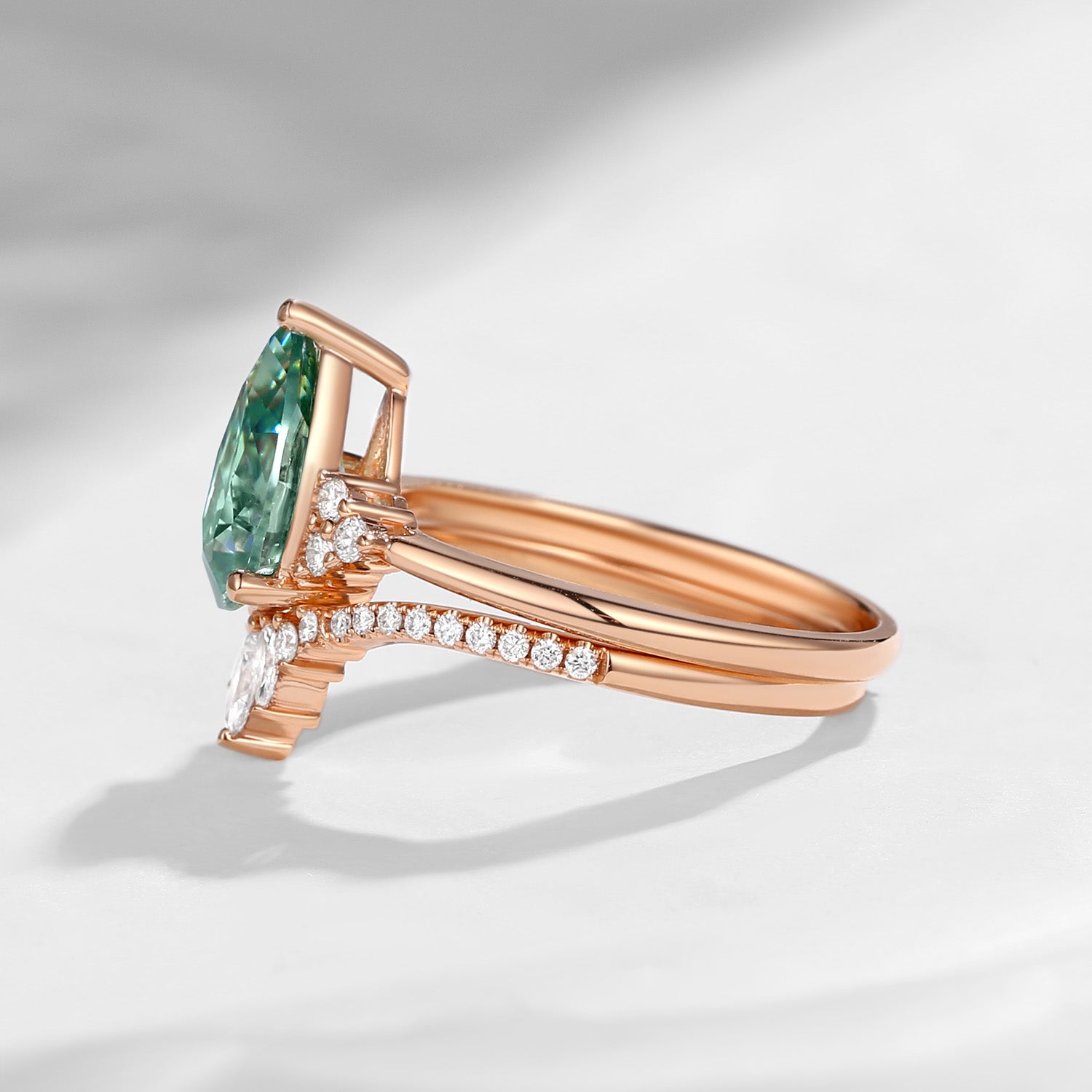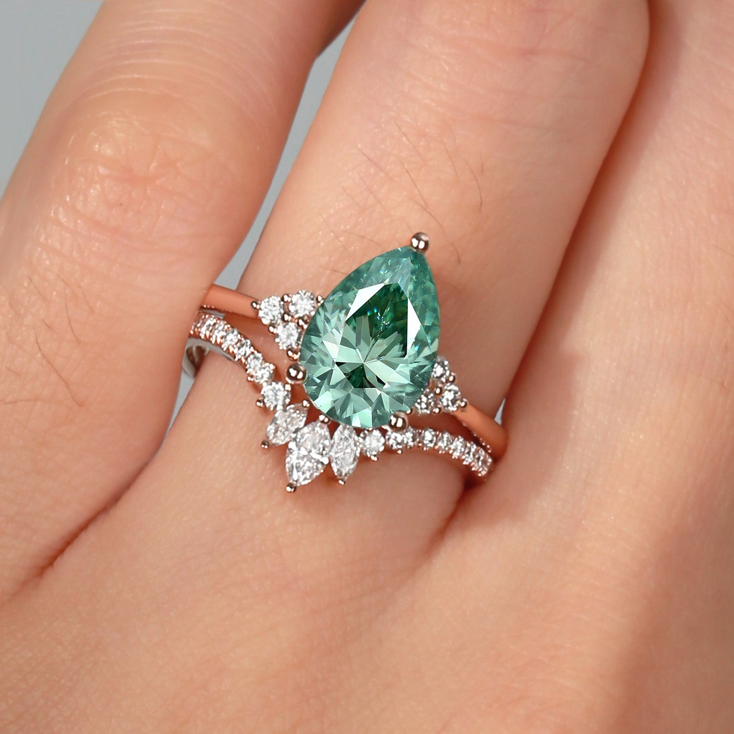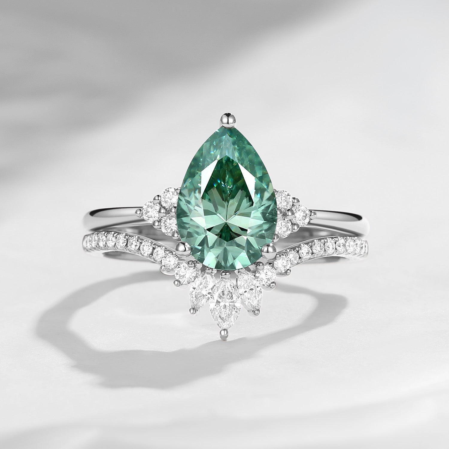 Pear Cut Green Moissanite Engagement Ring Set 2pcs - Vivian