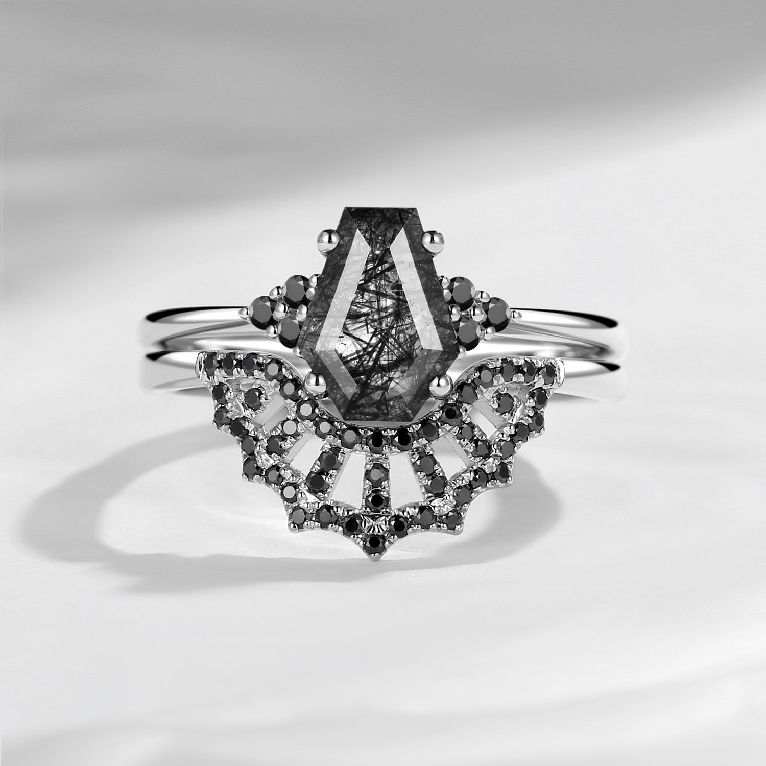Cluster Coffin Black Rutilated Quartz & Black Moissanite Spider Web Engagement Ring Set 2pcs