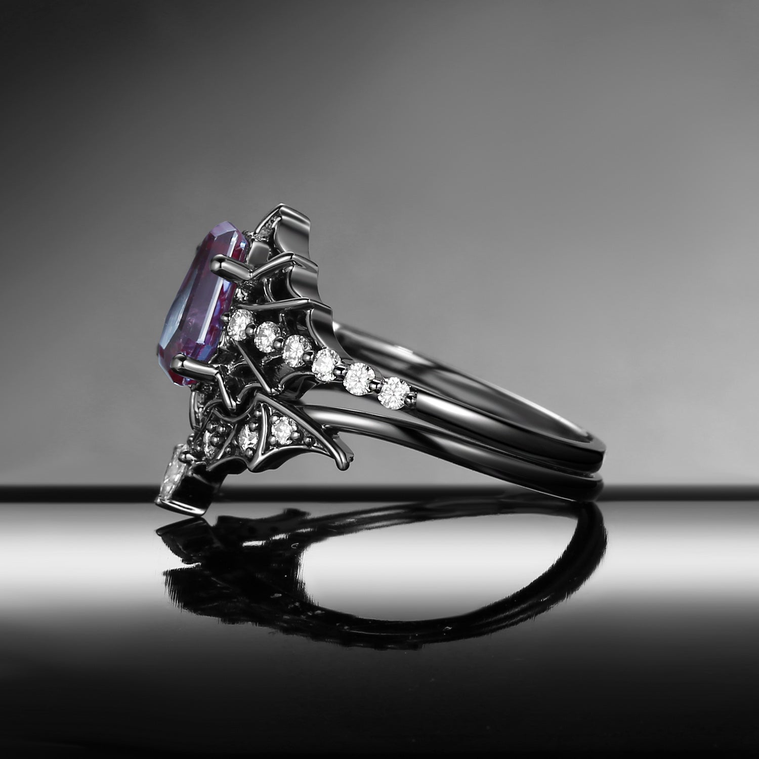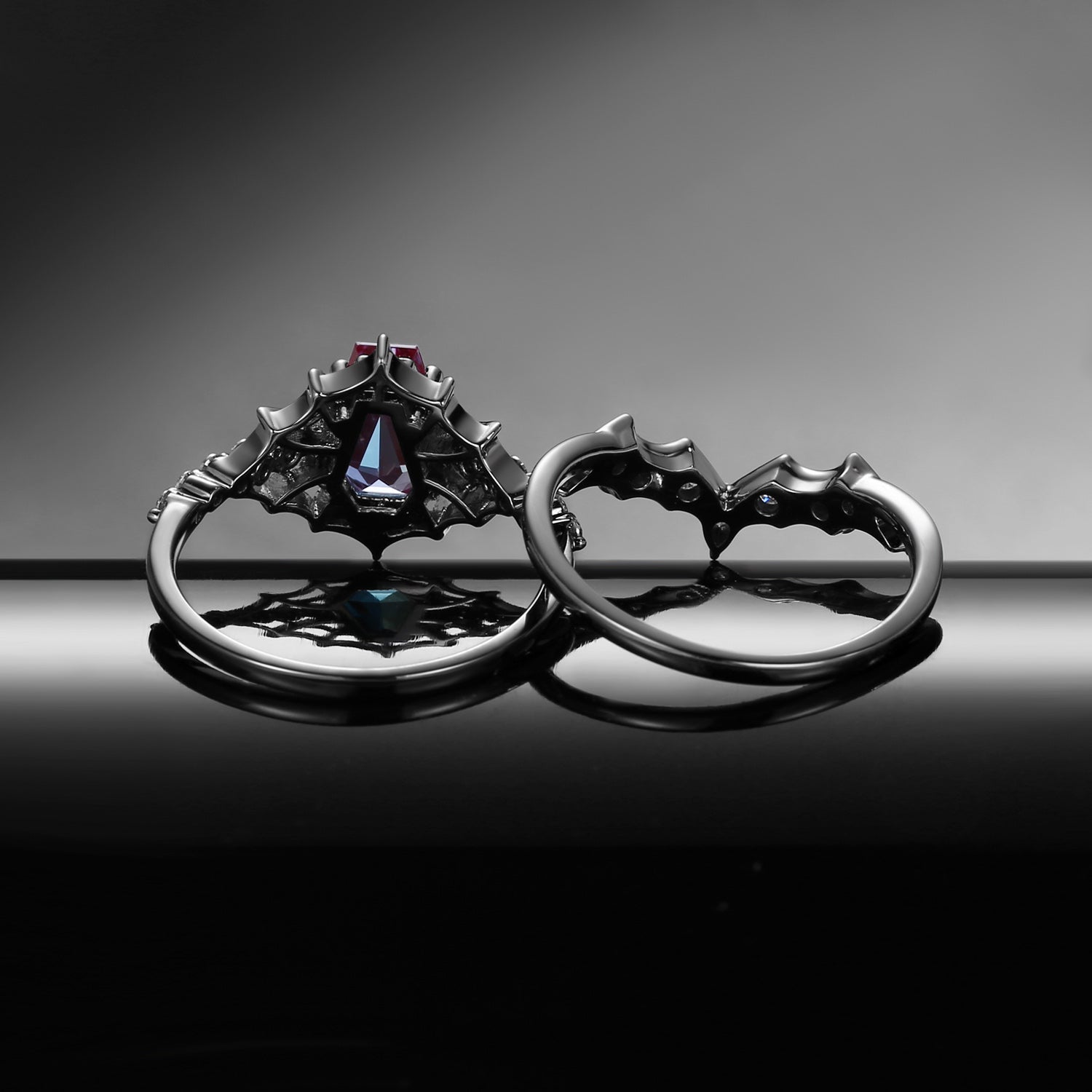 Gothic Inspired Coffin Lab Alexandrite Spider Web Black Gold Engagement Ring Set 2pcs