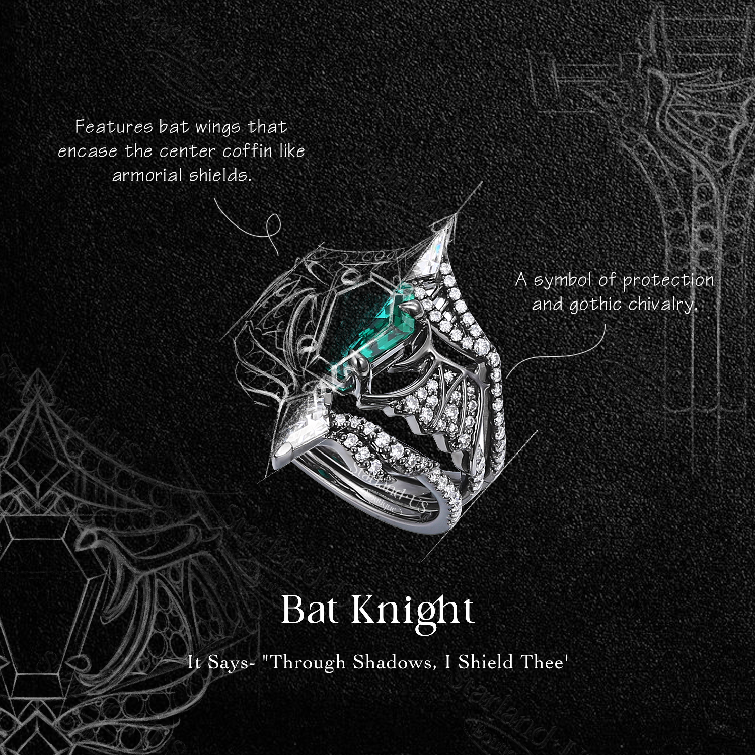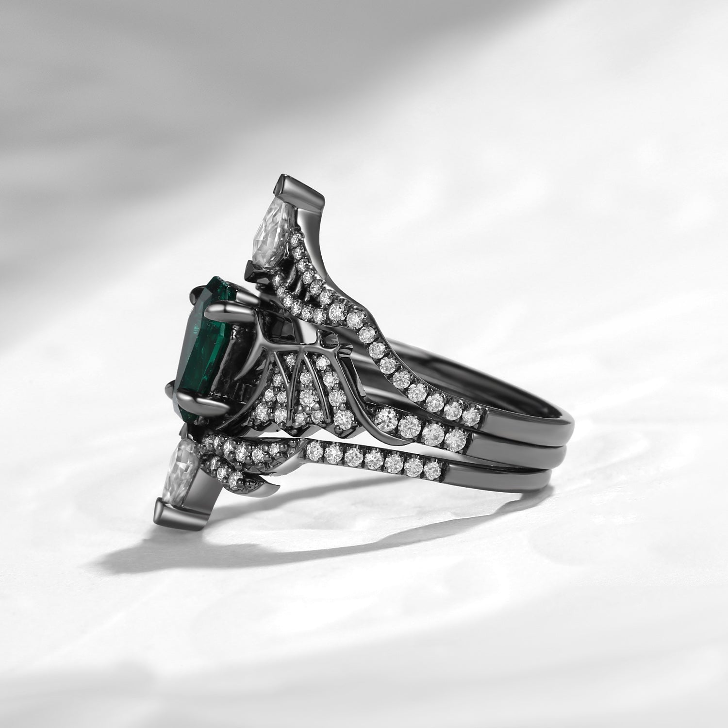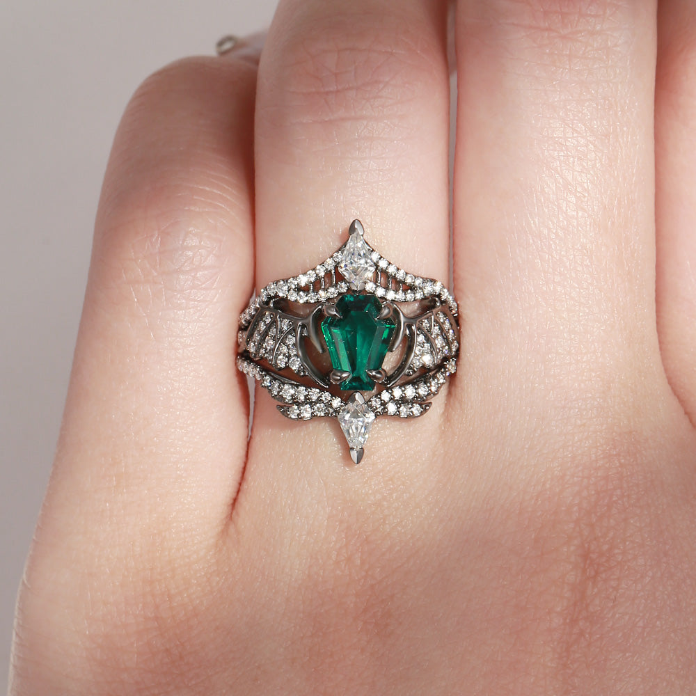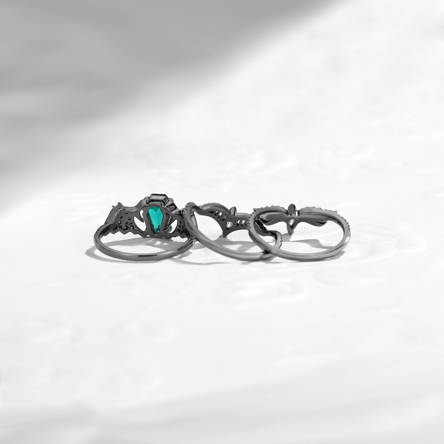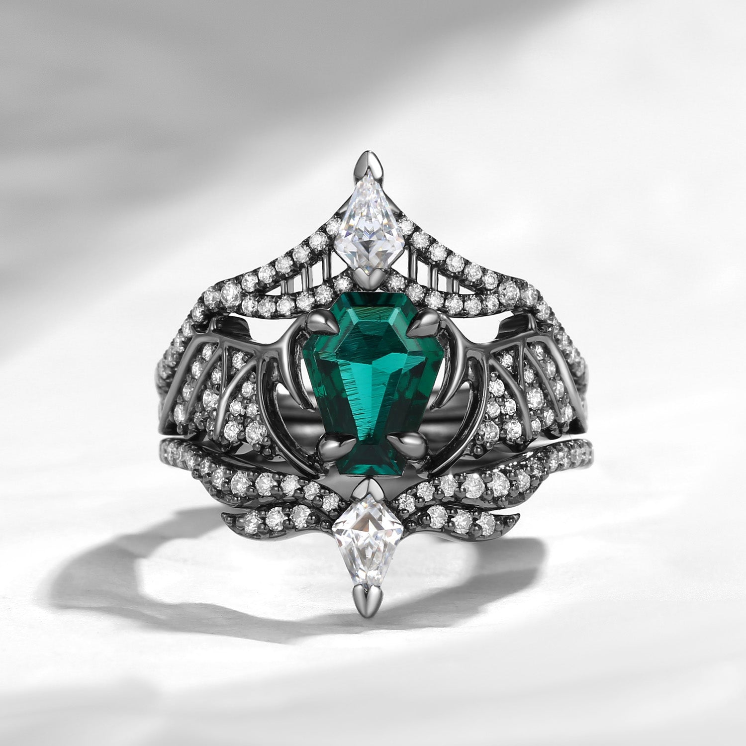 Maximalist Style Coffin Cut Lab Emerald Black Gold Bridal Set 3pcs - Bat Knight