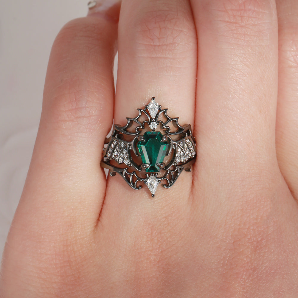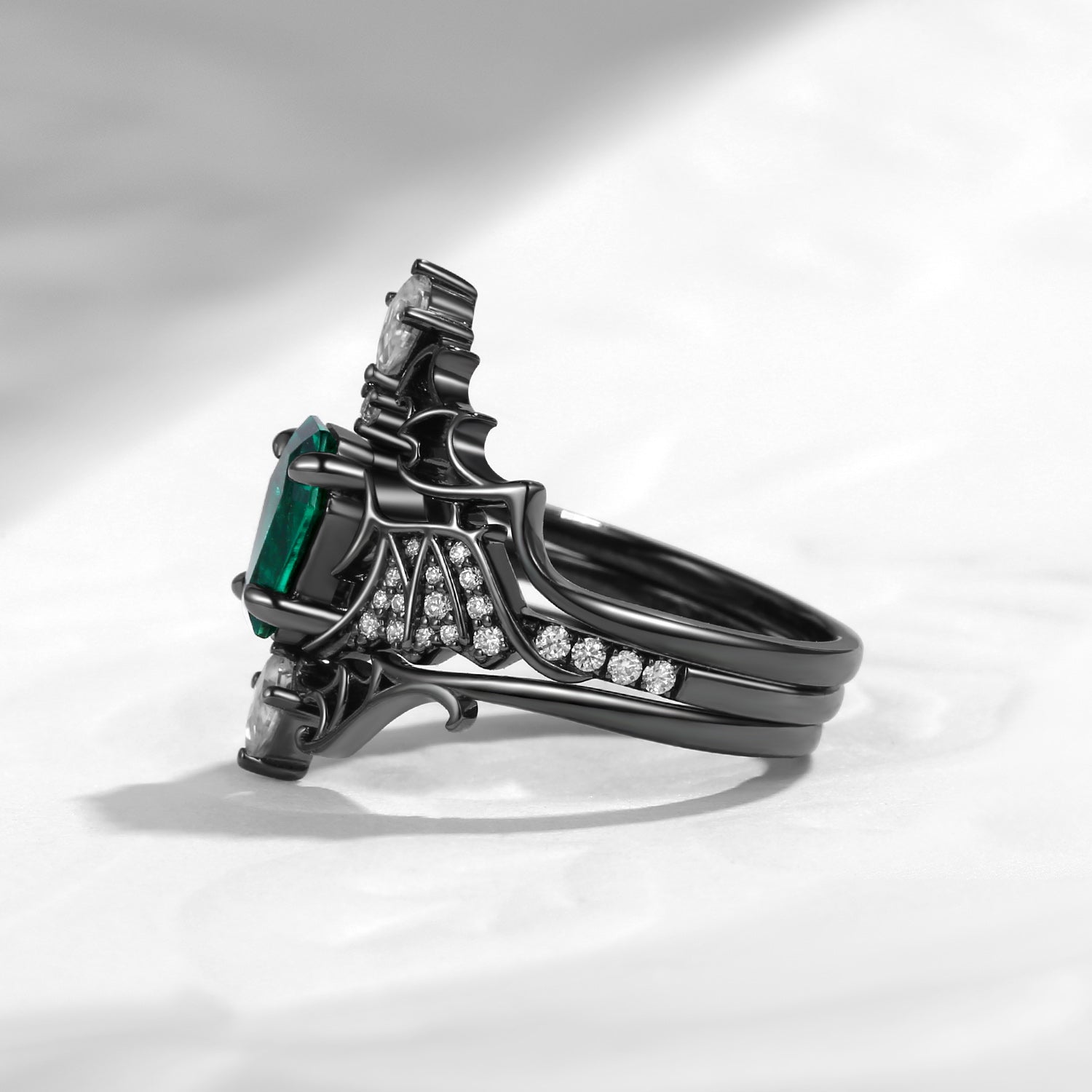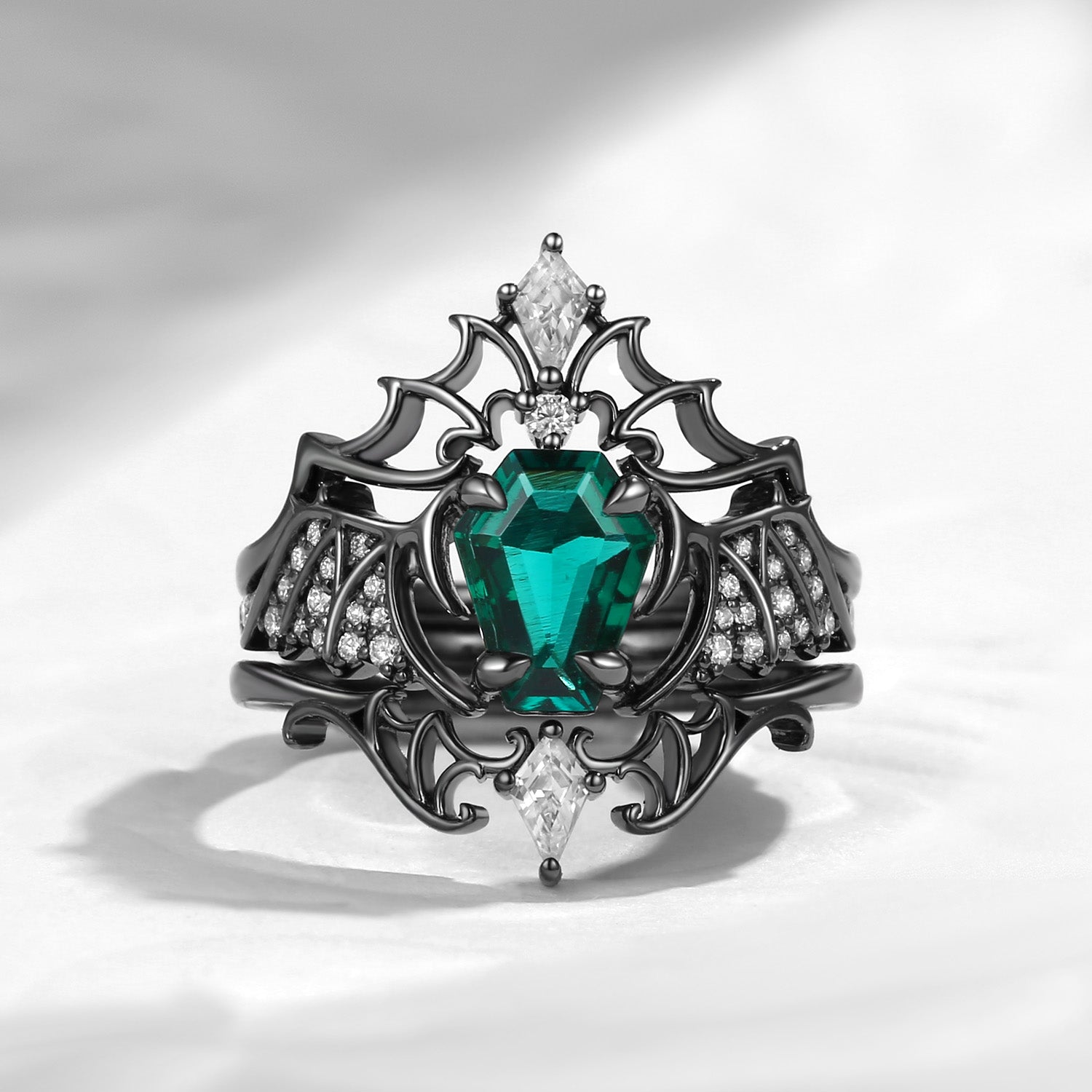 Non-Traditional Coffin Cut Lab Emerald Bat Wing Inspired Ring Black Gold Ring 3pcs