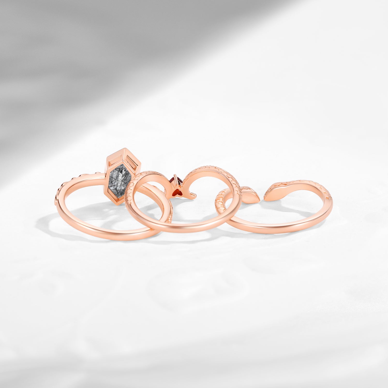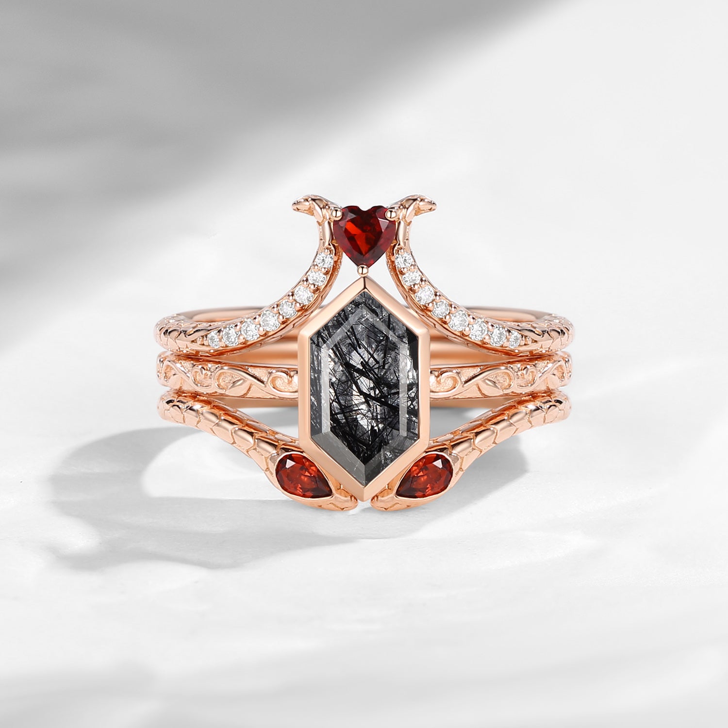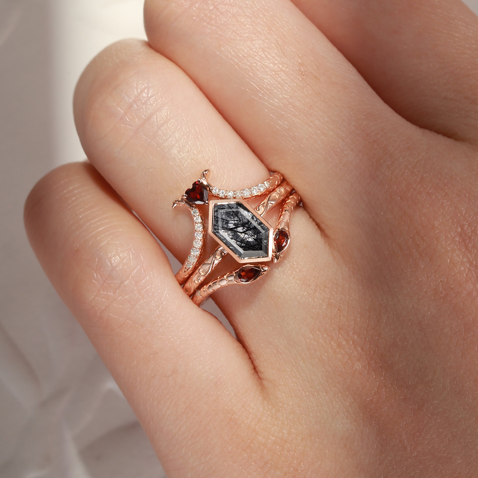 'Serpent's Allure' - Hexagon Cut Black Rutilated Quartz Vintage Bezel Engagement Ring Set 3pcs