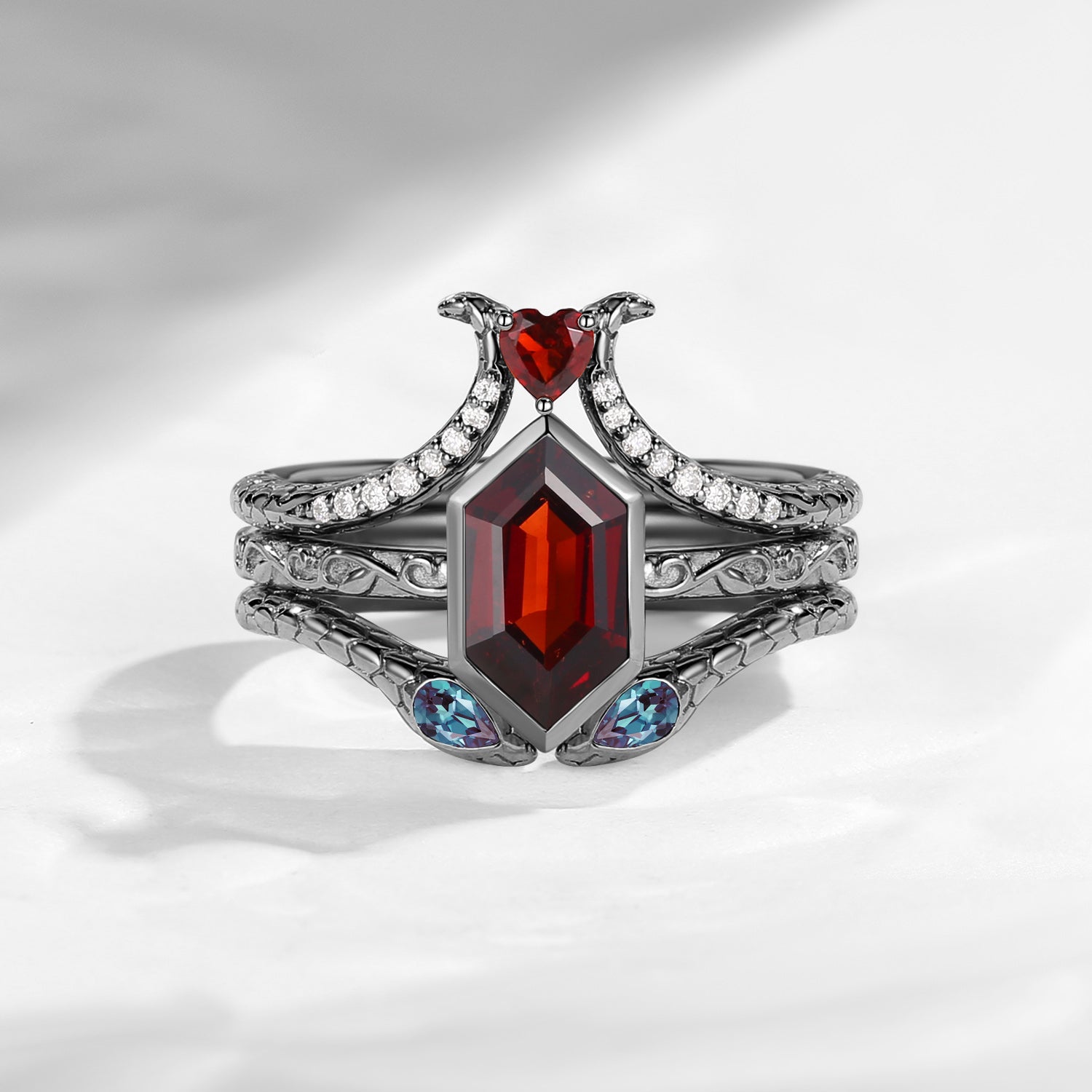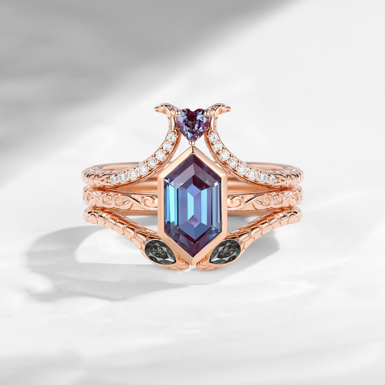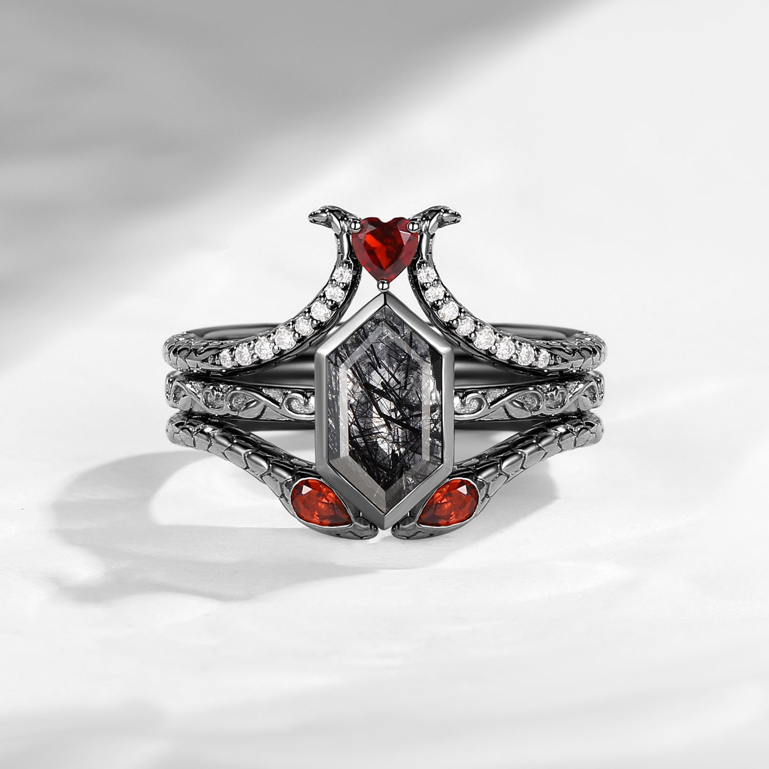 'Serpent's Allure' - Hexagon Cut Black Rutilated Quartz Vintage Bezel Engagement Ring Set 3pcs