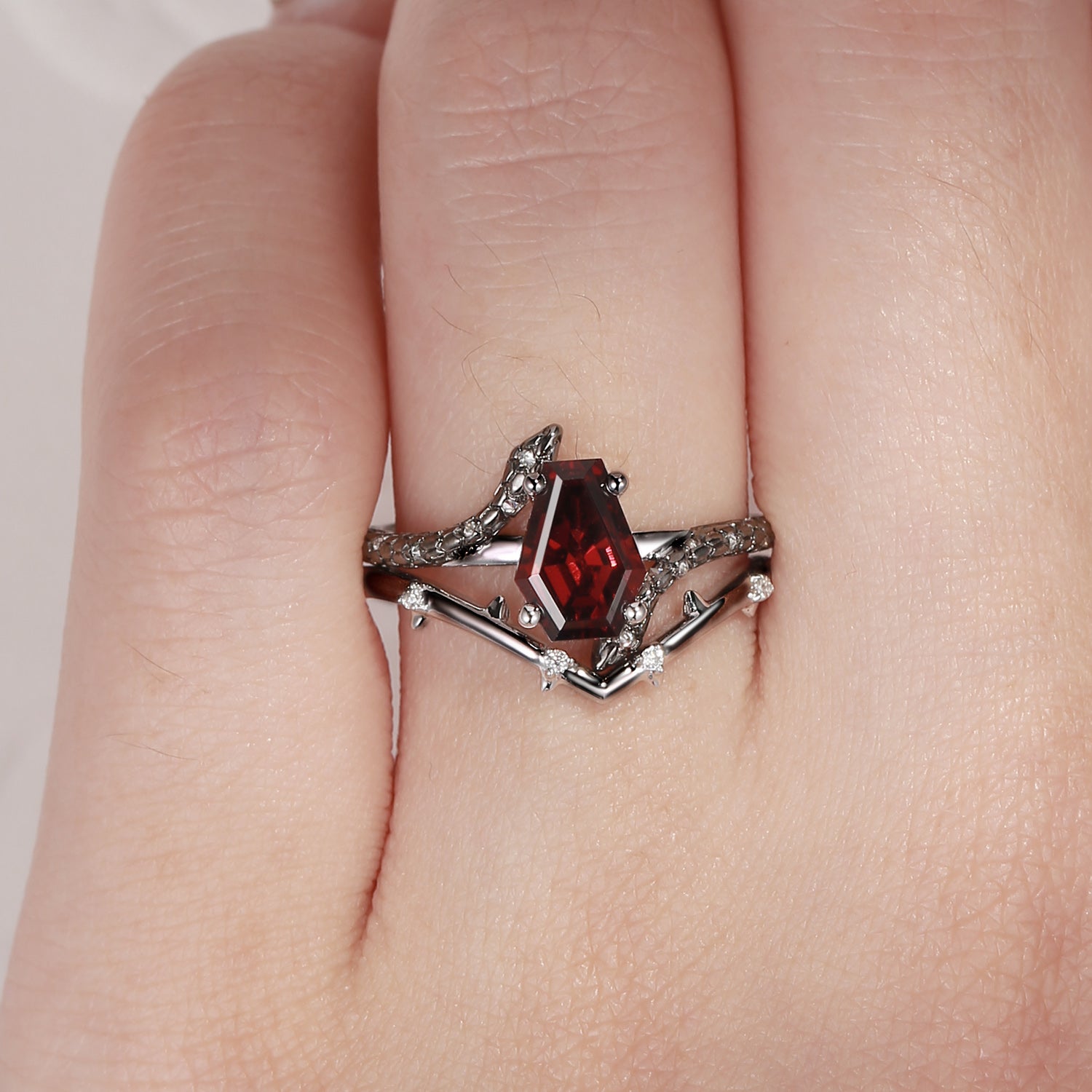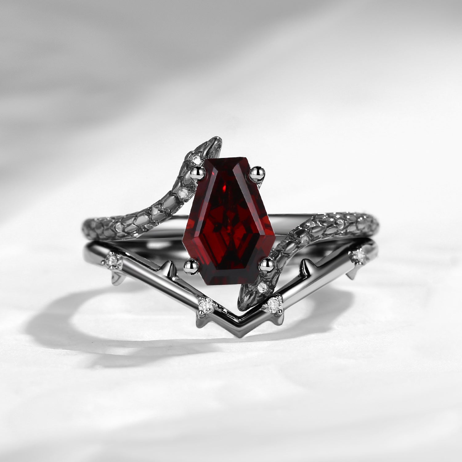Vintage Twist Coffin Cut Garnet Engagement Ring Set 2pcs - Serpent's Embrace