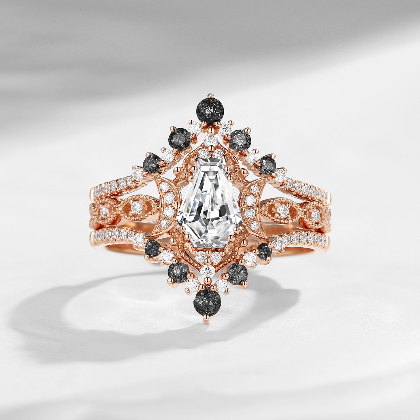 Crescent Moon | Coffin Cut Salt and Pepper Diamond Art-Deco Engagement Ring Set 3pcs