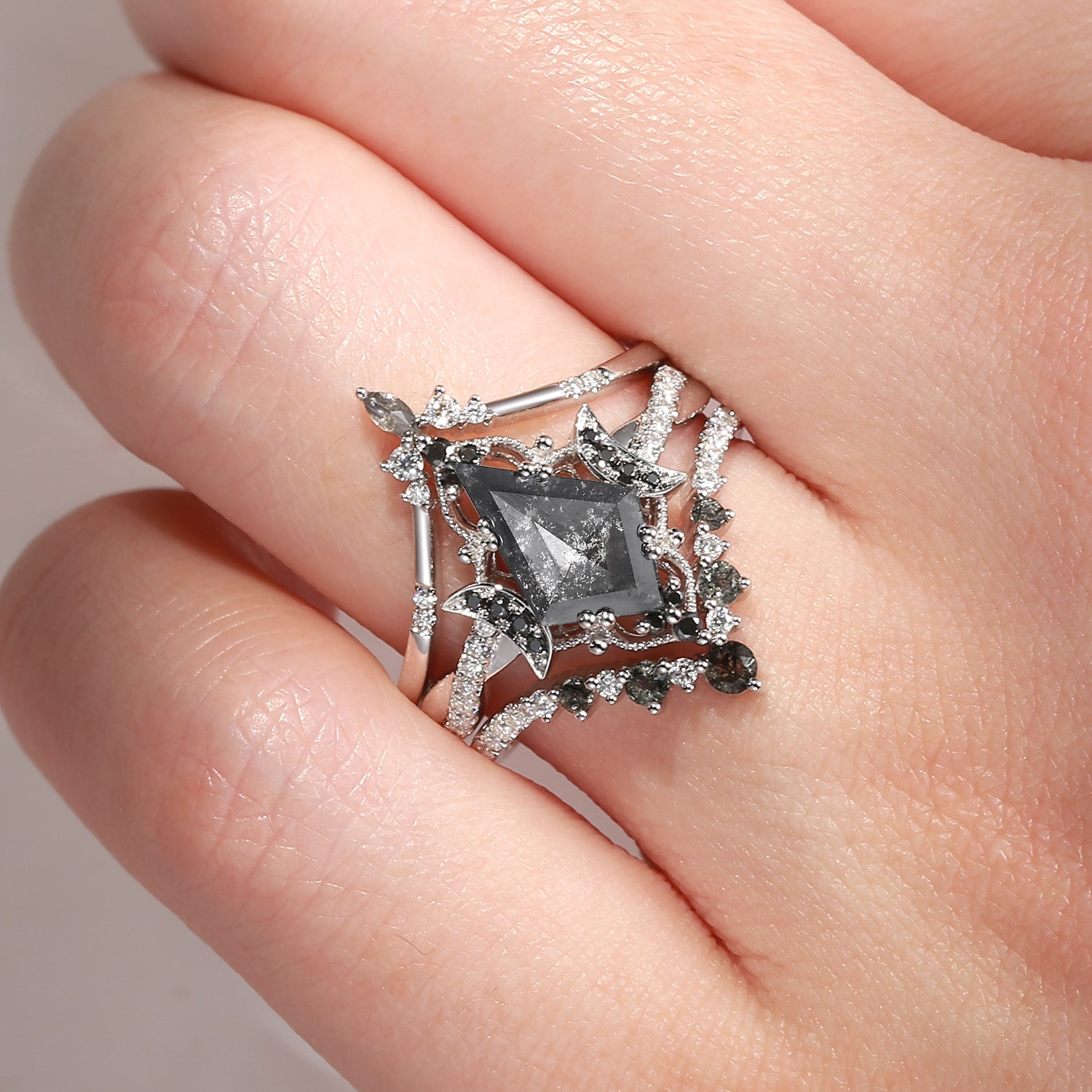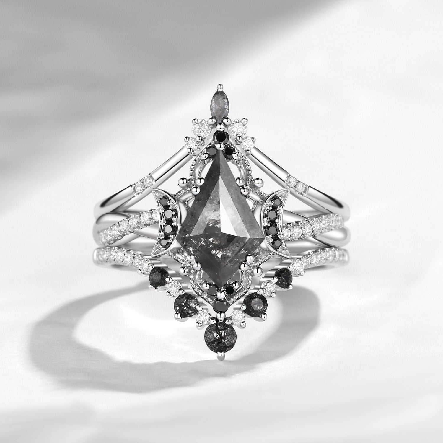 Crescent Moon | Kite Cut Salt and Pepper Diamond 'Noir' Engagement Ring Set 3pcs
