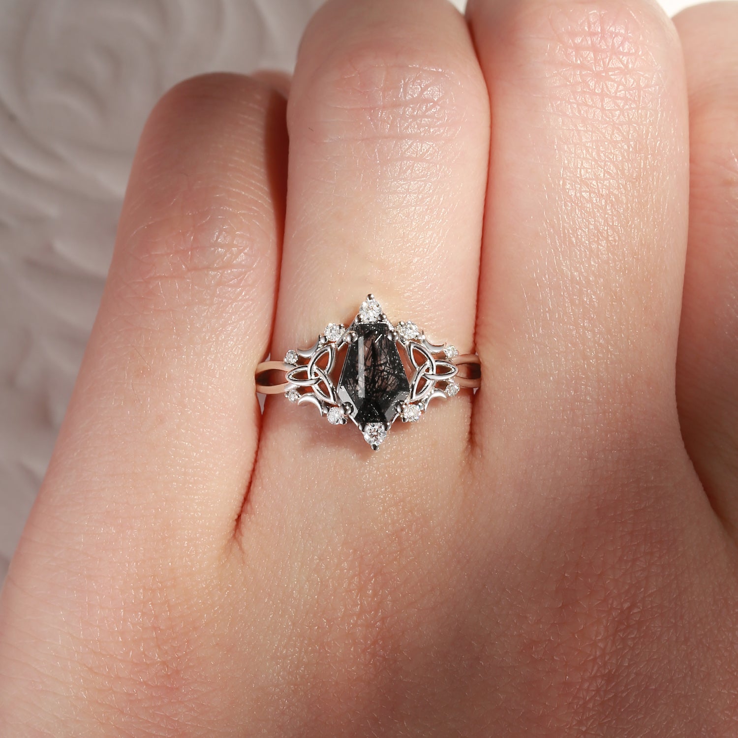 Celtic Moon | Coffin Black Rutilated Quartz Celtic Engagement Ring