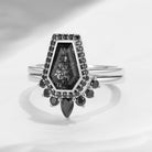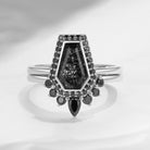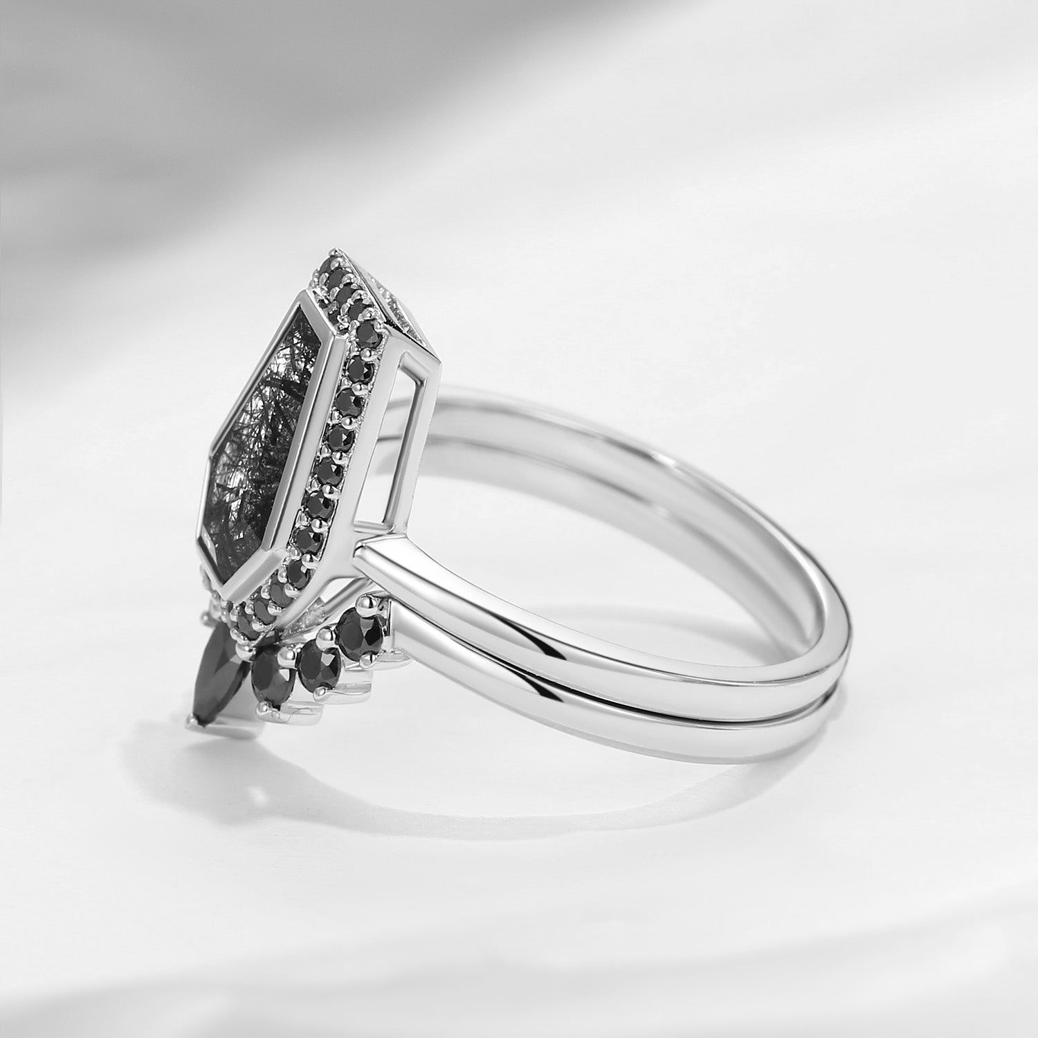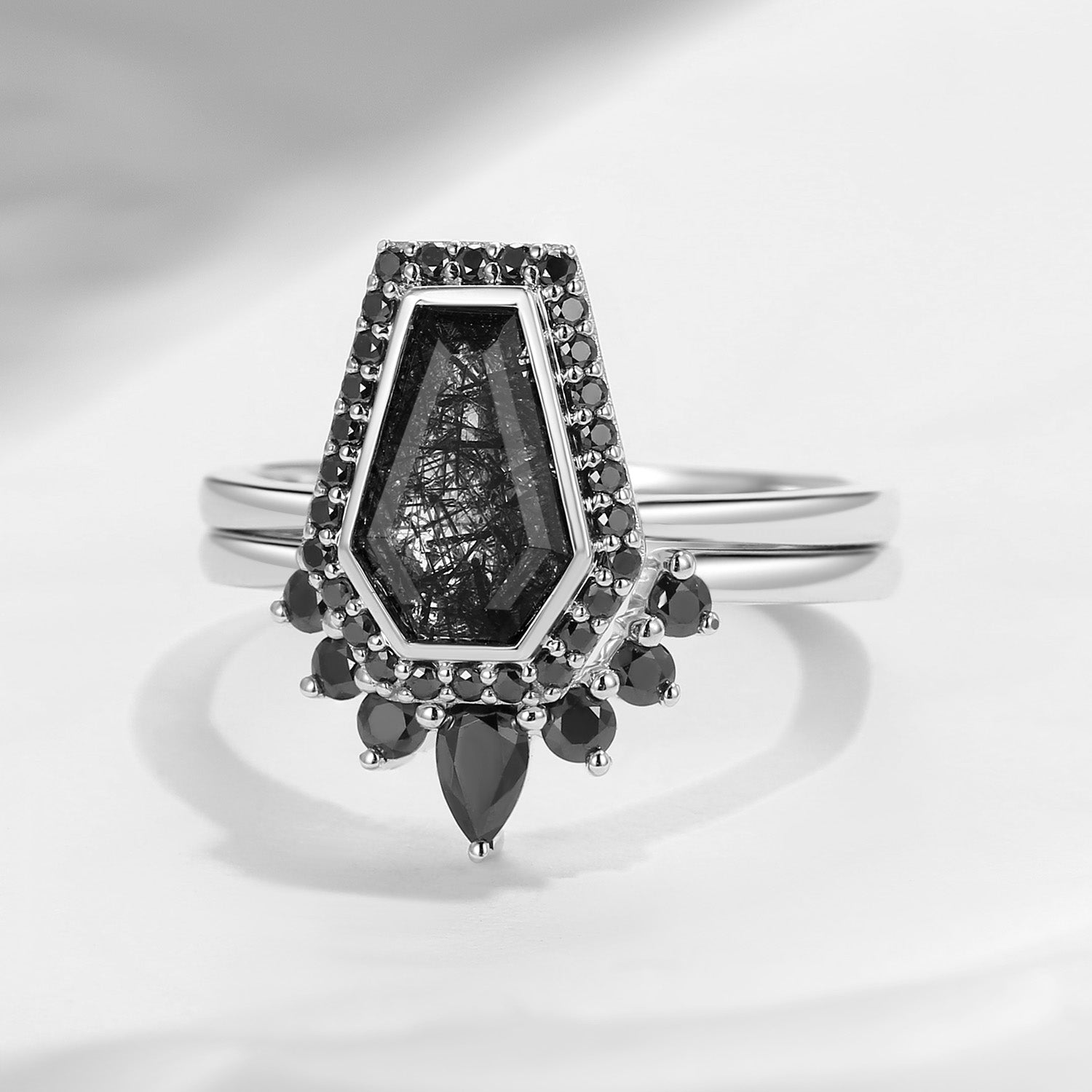 Coffin Cut Black Rutilated Quartz Engagement Ring Set 2pcs - Goth Girl