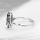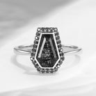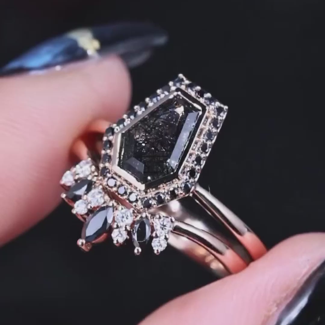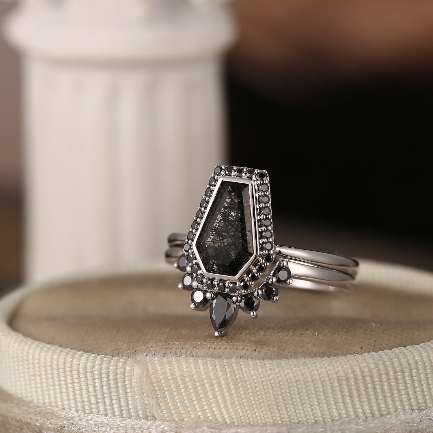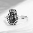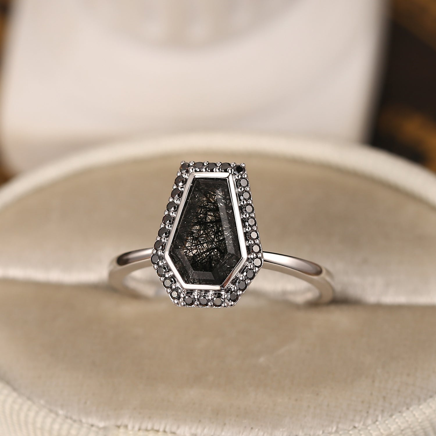 Coffin Cut Black Rutilated Quartz Halo Engagement Ring - Goth Girl