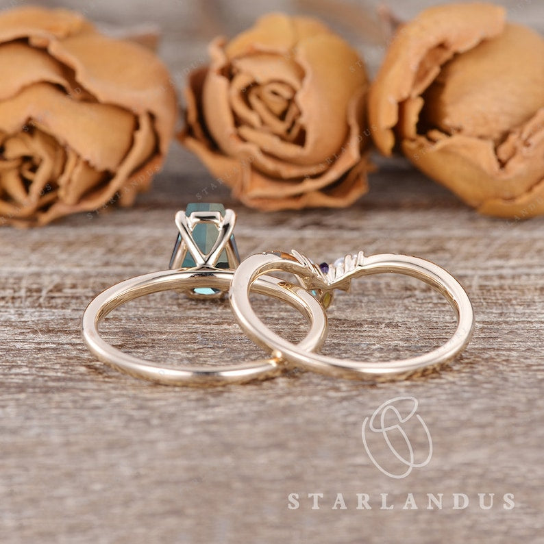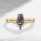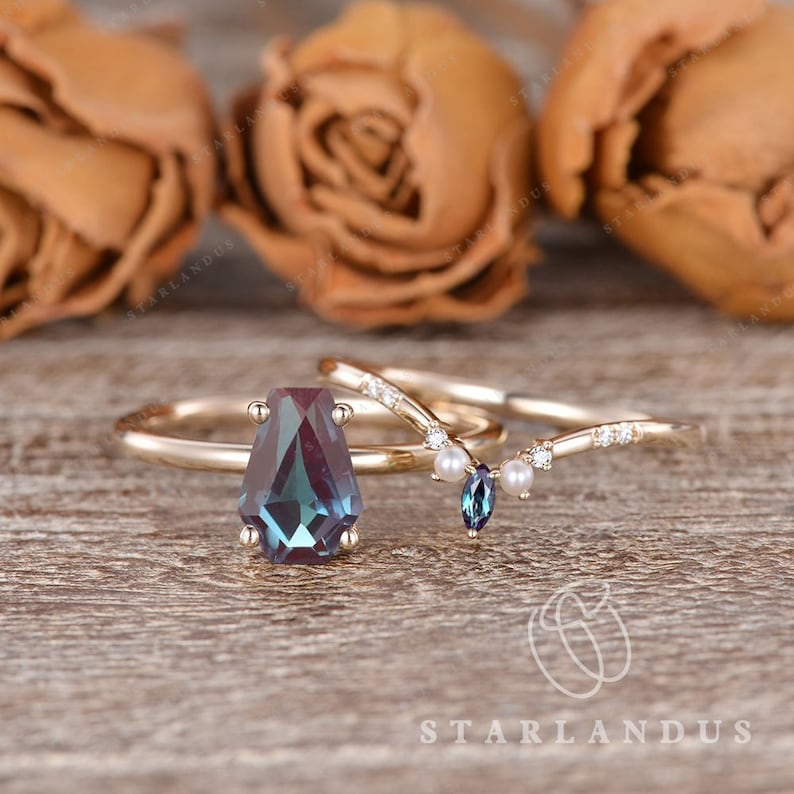 Coffin Cut Lab Alexandrite Ring Set 2pcs Yellow Gold Engagement Ring Stacking Bridal Set 2pcs Women Solitaire Pearl Wedding Band
