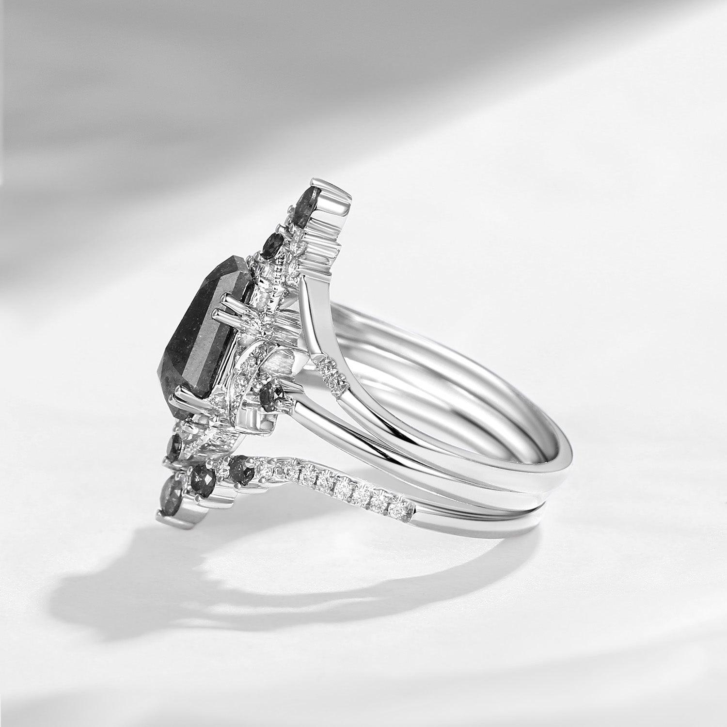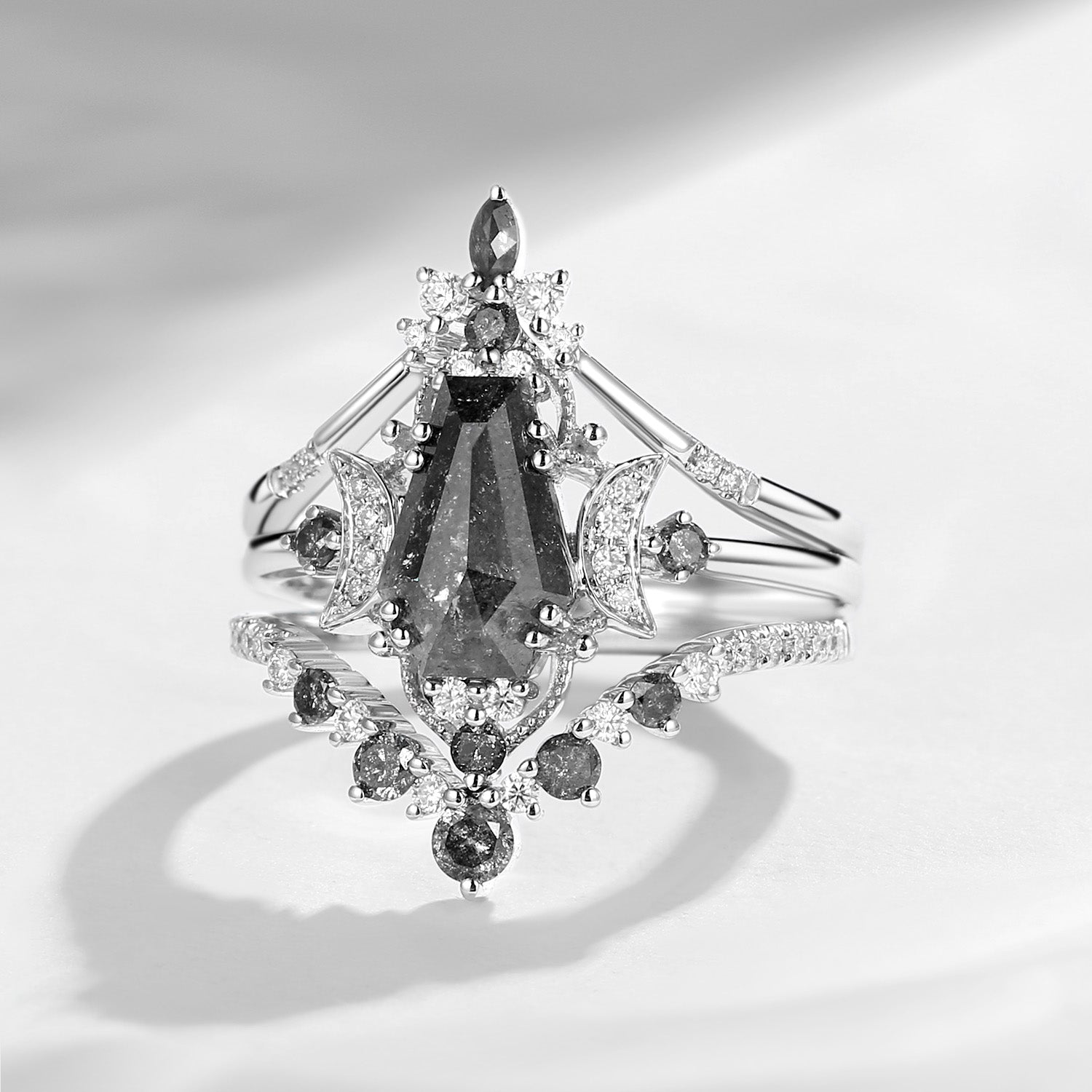 Crescent Moon | Coffin Cut Salt and Pepper Diamond 'Extravanganza' Engagement Ring Set 3pcs