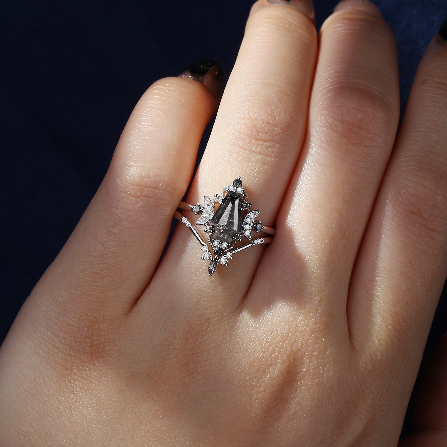 Crescent Moon | Coffin Cut Salt and Pepper Diamond Engagement Ring Set 2pcs