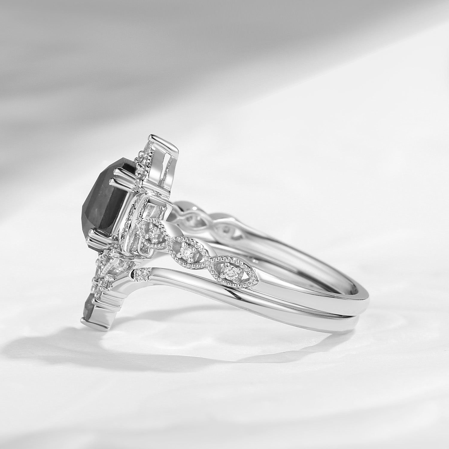 18K Unique Coffin Cut Natural Salt And Pepper Diamond Engagement Ring Set 2pcs