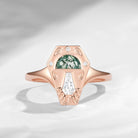 Half Moon Cut Moss Agate + Coffin Cut Moissanite 'Tree of Life' Stamp Engagement Ring