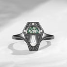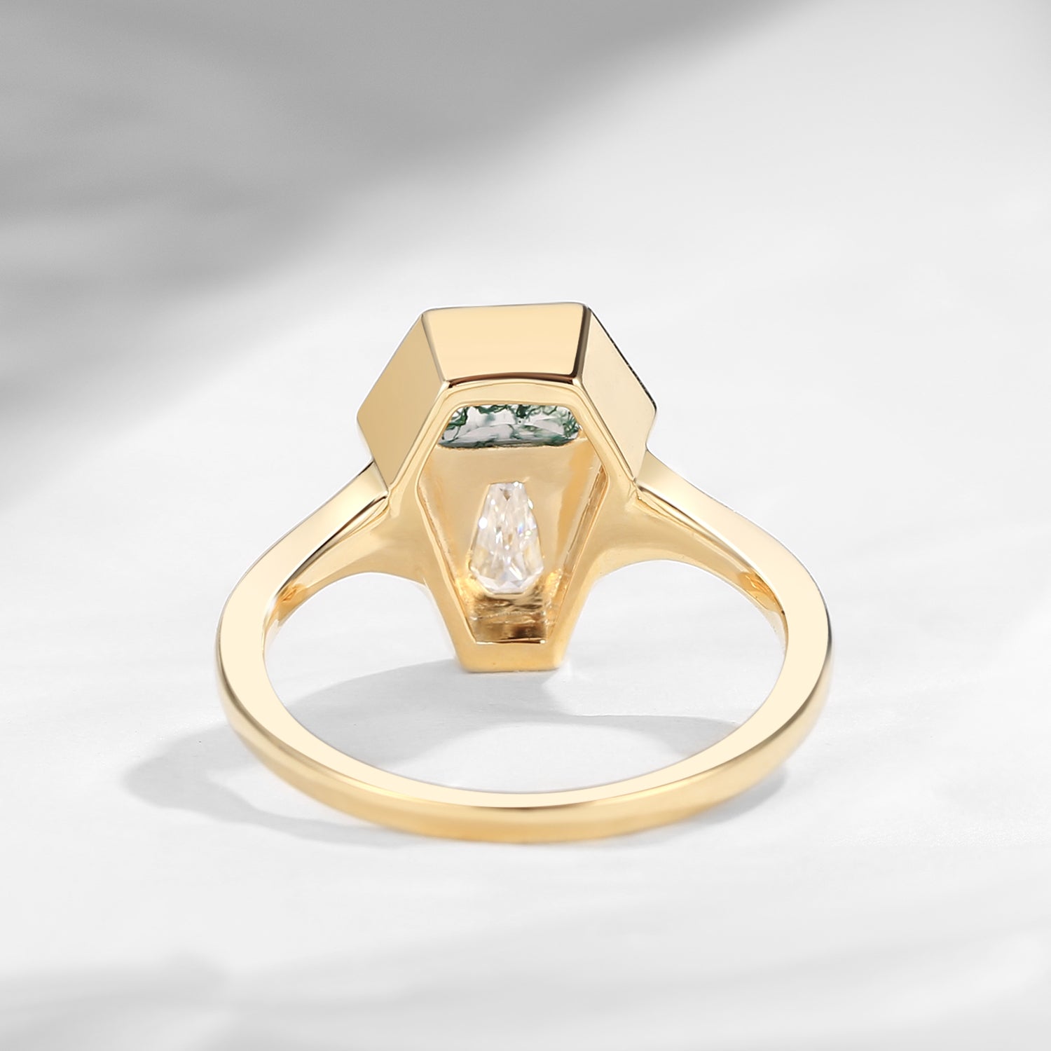 ⟢ Center Stone: Faceted Coffin Cut Moissanite, 3*5mm; Half Moon Cut Moss Agate 3.2*5.6mm.