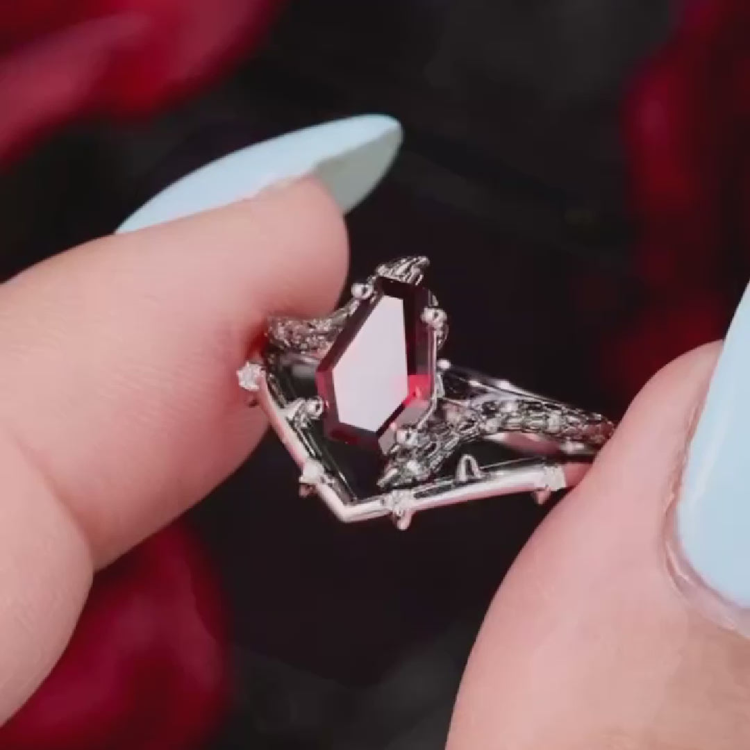 Vintage Twist Coffin Cut Garnet Engagement Ring Set 2pcs - Serpent's Embrace