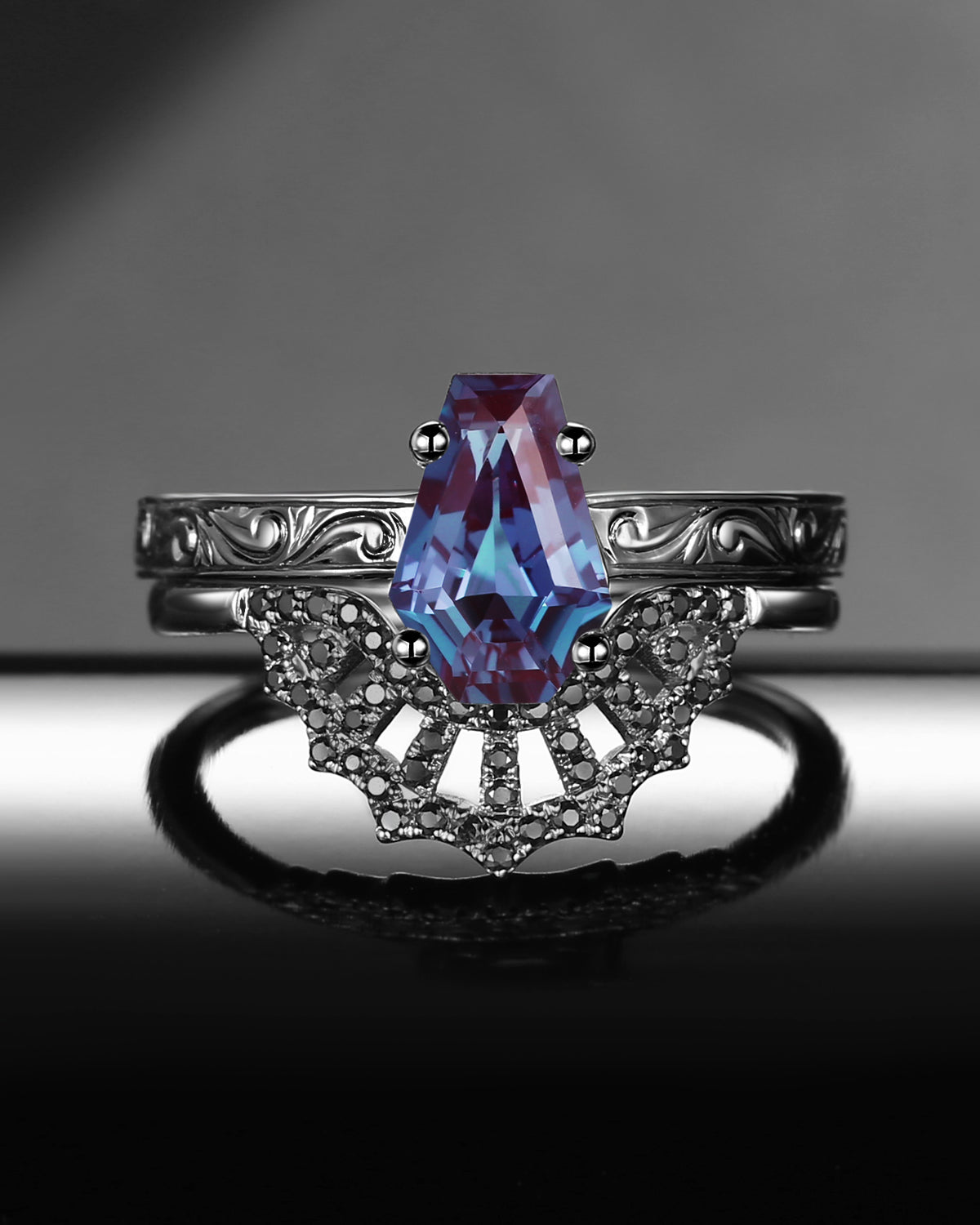 Vintage Inspired Coffin Cut Lab Alexandrite Ring Black Gold Bridal Set 3pcs