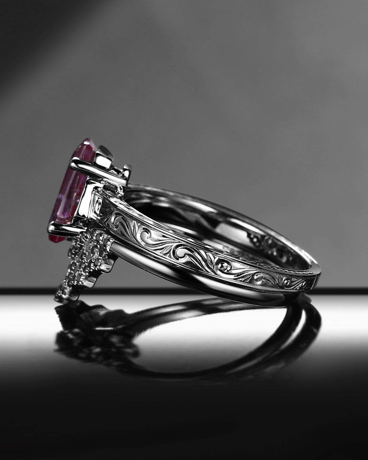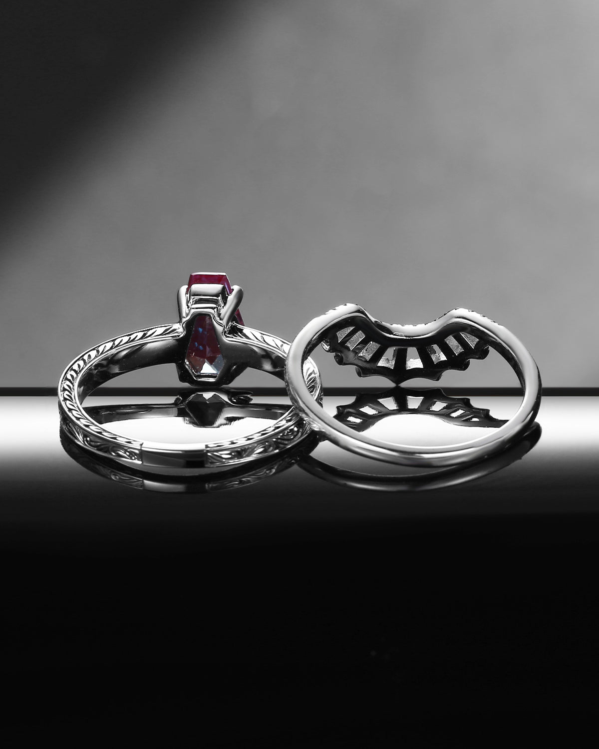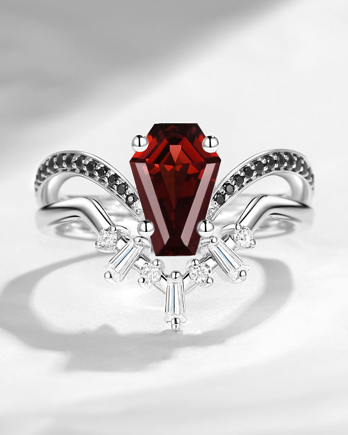 Vintage Inspired Coffin Cut Garnet Curved Engagement Ring Set 2pcs