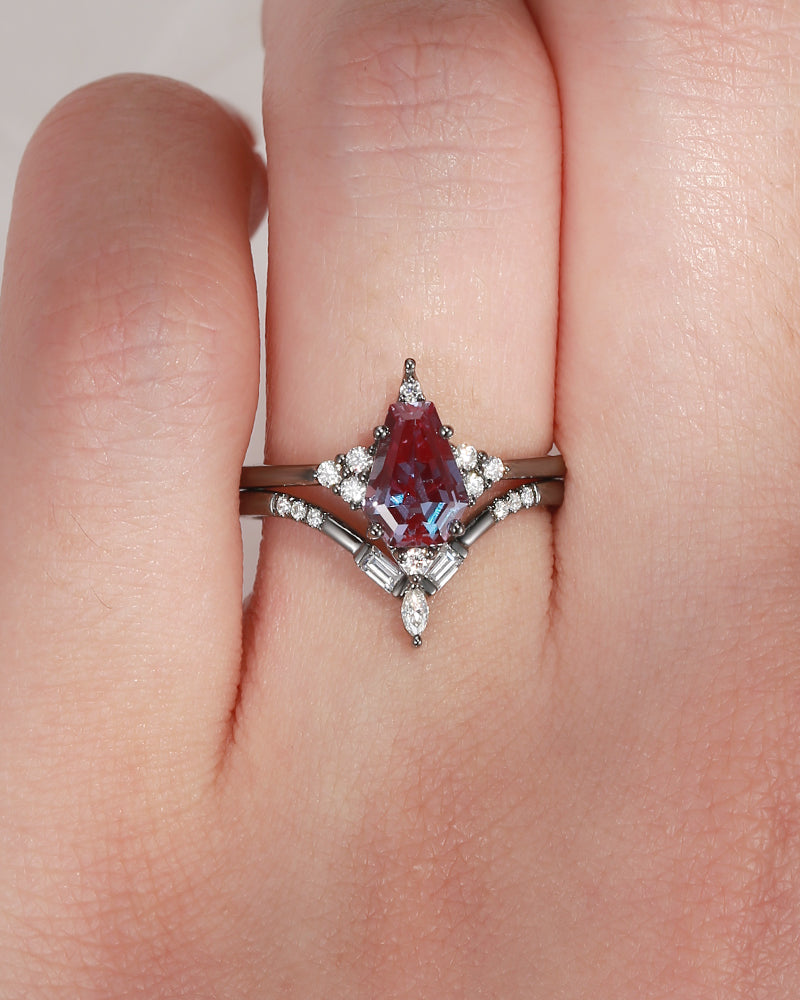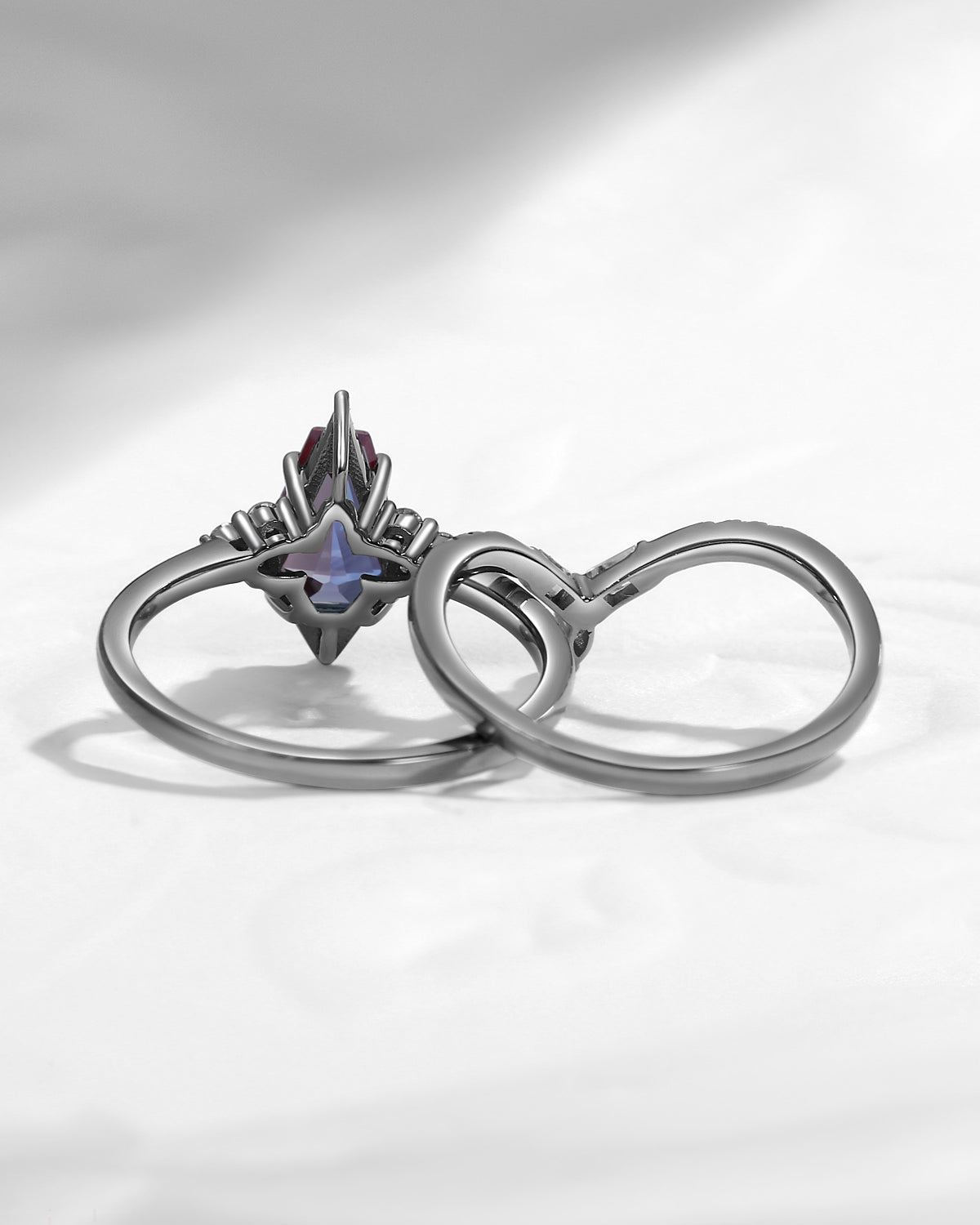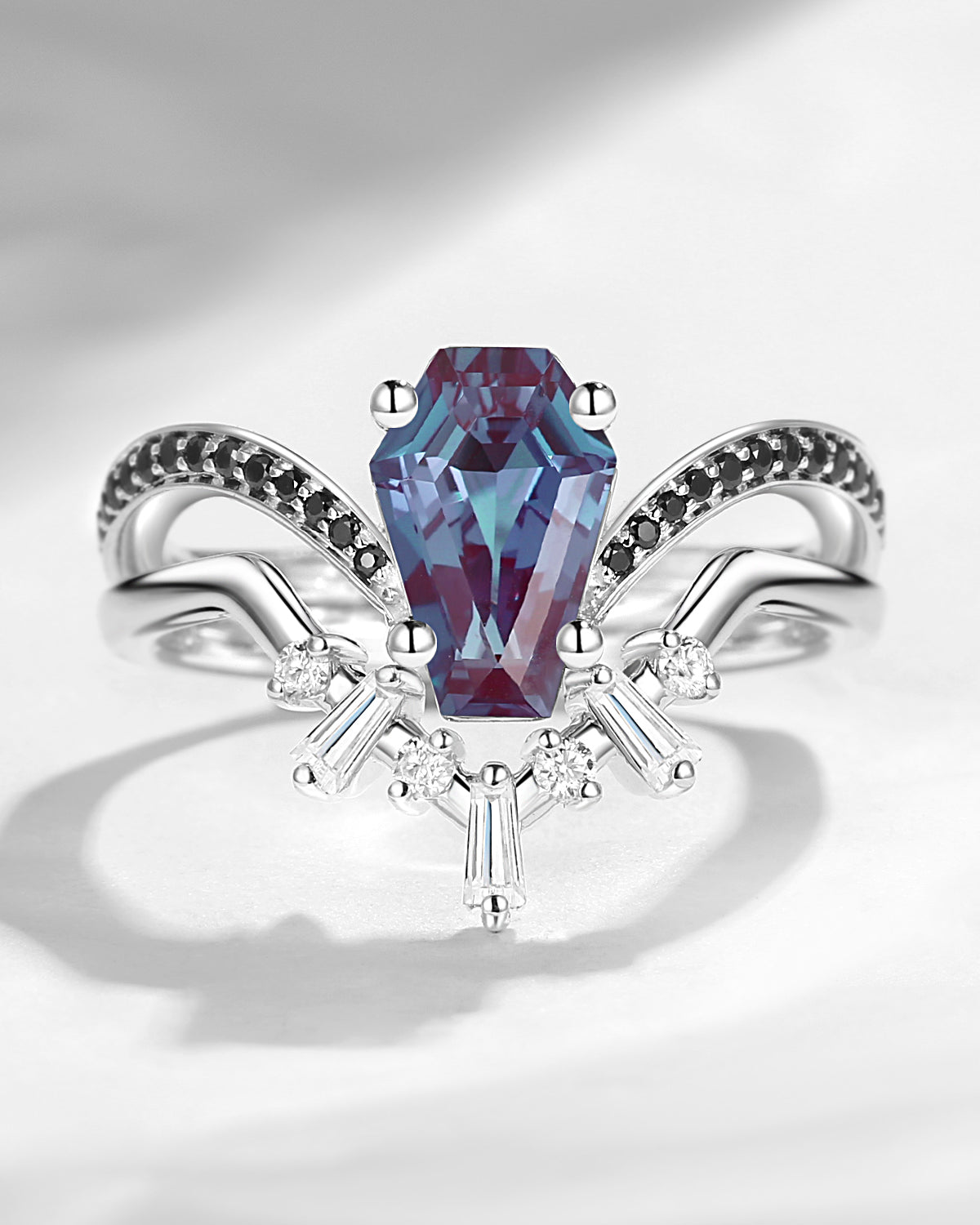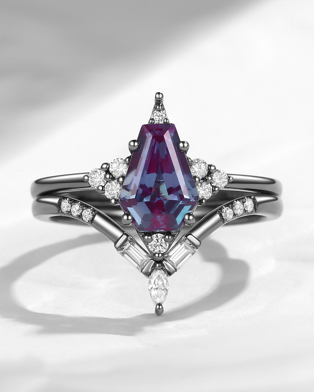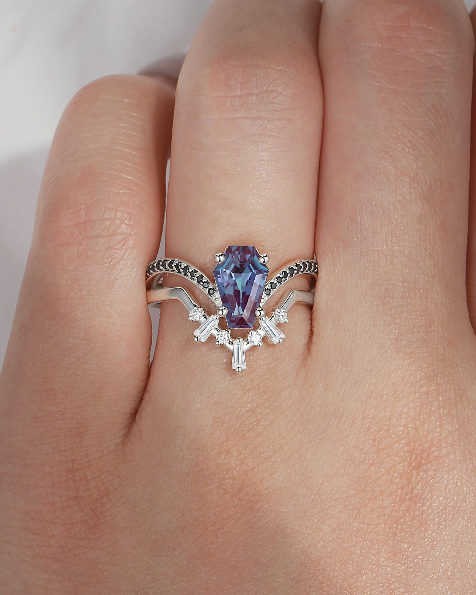 Vintage Coffin Cut Lab Alexandrite Curved Bridal Set 2pcs